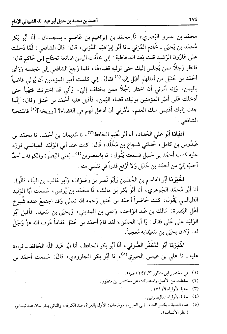 محمد بن عمرو البصري نا محمد بن إبراهيم بن عاصم بسجستان أنا أبو بكر محمد بن يحيى خادم المزني نا أبو إبراهيم المزني قال قال الشافعي لما دخلت على هارون الرشيد قلت بعد المخاطبة إني خلفت اليمن ضائعة تحتاج إلى حاكم قال فانظر رجلا ممن يجلس إليك حتى توليه قضاءها فلما رجع الشافعي إلى مجلسه ورأى أحمد بن حنبل من أمثلهم أقبل إليه (1) فقال إني كلمت أمير المؤمنين أن يولي قاضيا باليمن وإنه أمرني أن اختار رجلا ممن يختلف إلي وأني قد اخترتك فتهيأ حتى أدخلك على أمير المؤمنين يوليك قضاء اليمن فأقبل عليه أحمد بن حنبل وقال إنما جئت إليك أقتبس منك العلم تأمرني أن أدخل لهم في القضاء ووبخه (2) فاستحيا الشافعي أنبأنا أبو علي الحداد أنا أبو نعيم الحافظ (3) نا سليمان بن أحمد نا محمد بن عبدوس بن كامل حدثني شجاع بن مخلد قال كنت عند أبي الوليد الطيالسي فورد عليه كتاب أحمد بن حنبل فسمعته يقول ما بالمصرين (4) يعني البصرة والكوفة أحد أحب إلي من أحمد بن حنبل ولا أرفع قدرا في نفسي منه أخبرنا أبو القاسم بن الحصين وأبو نصر بن رضوان وأبو غالب بن البنا قالوا أنا أبو محمد الجوهري أنا أبو بكر بن مالك نا محمد بن يونس سمعت أبا الوليد الطيالسي يقول كنت حاضرا أحمد بن حنبل رحمه الله تعالى وقد اجتمع عنده شيوخ أهل البصرة مالك بن عبد الواحد وعلي بن المديني ويحيى بن سعيد فأقبل أبو الوليد على علي فقال يا أبا الحسن لقد قام أحمد بن حنبل مقاما عرف الله عز وجل له وكان يحيى بن سعيد به معجبا أخبرنا أبو المظفر الصوفي أنا أبو بكر الحافظ أنا أبو عبد الله الحافظ قراءة عليه نا علي بن عيسى الحيري (5) نا أبو بكر الجارودي قال سمعت أحمد بن