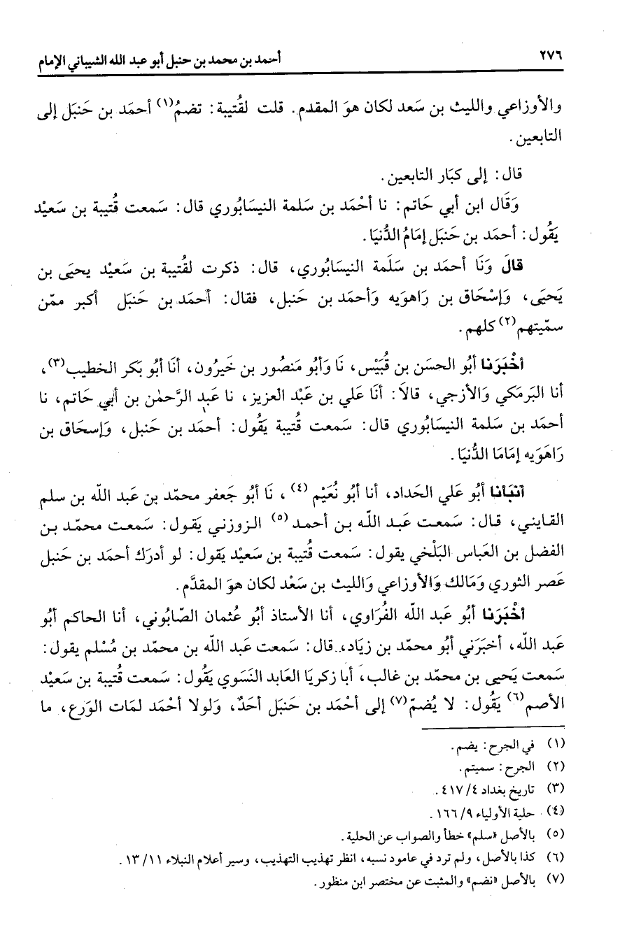 والأوزاعي والليث بن سعد لكان هو المقدم قلت لقتيبة تضم (1) أحمد بن حنبل إلى التابعين قال إلى كبار التابعين وقال ابن أبي حاتم نا أحمد بن سلمة النيسابوري قال سمعت قتيبة بن سعيد يقول أحمد بن حنبل إمام الدنيا قال ونا أحمد بن سلمة النيسابوري قال ذكرت لقتيبة بن سعيد يحيى بن يحيى وإسحاق بن راهوية وأحمد بن حنبل فقال أحمد بن حنبل أكثر ممن سميتهم (2) كلهم أخبرنا أبو الحسن بن قبيس نا وأبو منصور بن خيرون أنا أبو بكر الخطيب (3) أنا البرمكي والأزجي قالا أنا علي بن عبد العزيز نا عبد الرحمن بن أبي حاتم نا أحمد بن سلمة النيسابوري قال سمعت قتيبة يقول أحمد بن حنبل وإسحاق بن راهوية إماما الدنيا أنبأنا أبو علي الحداد أنا أبو نعيم (4) نا أبو جعفر محمد بن عبد الله بن سلم القايني قال سمعت عبد الله بن أحمد (5) الزوزني يقول سمعت محمد بن الفضل بن العباس البلخي يقول سمعت قتيبة بن سعيد يقول لو أدرك أحمد بن حنبل عصر الثوري ومالك والأوزاعي والليث بن سعد لكان هو المقدم أخبرنا أبو عبد الله الفراوي أنا الأستاذ أبو عثمان الصابوني أنا الحاكم أبو عبد الله أخبرني أبو محمد بن زياد قال سمعت عبد الله بن محمد بن مسلم يقول سمعت يحيى بن محمد بن غالب أبا زكريا العابد النسوي يقول سمعت قتيبة بن سعيد الأصم (6) يقول لا يضم (7) إلى أحمد بن حنبل أحد ولولا أحمد لمات الورع ما