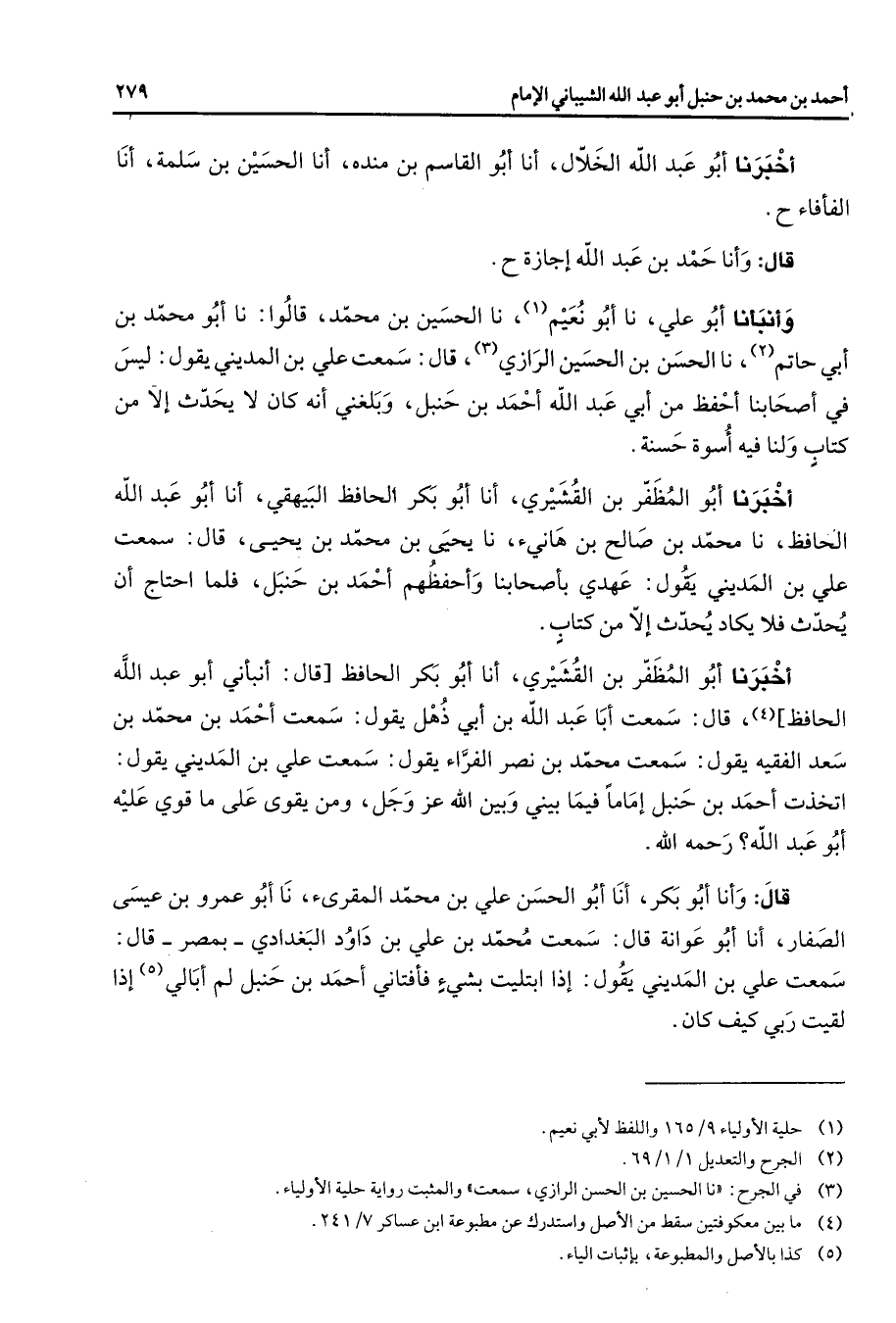 أخبرنا أبو عبد الله الخلال أنا أبو القاسم بن منده أنا الحسين بن سلمة أنا الفأفاء قال وأنا حمد بن عبد الله إجازة وأنبأنا أبو علي نا أبو نعيم (1) نا الحسين بن محمد قالوا نا أبو محمد بن أبي حاتم (2) نا الحسن بن الحسين الرازي (3) قال سمعت علي بن المديني يقول ليس في أصحابنا أحفظ من أبي عبد الله أحمد بن حنبل وبلغني أنه كان لا يحدث إلا من كتاب ولنا فيه أسوة حسنة أخبرنا أبو المظفر بن القشيري أنا أبو بكر الحافظ البيهقي أنا أبو عبد الله الحافظ نا محمد بن صالح بن هانئ نا يحيى بن محمد بن يحيى قال سمعت علي بن المديني يقول عهدي بأصحابنا وأحفظهم أحمد بن حنبل فلما احتاج أن يحدث فلا يكاد يحدث إلا من كتاب أخبرنا أبو المظفر بن القشيري أنا أبو بكر الحافظ قال أنبأني أبو عبد الله الحافظ (4) قال سمعت أبا عبد الله بن أبي ذهل يقول سمعت أحمد بن محمد بن سعد الفقيه يقول سمعت محمد بن نصر الفراء يقول سمعت علي بن المديني يقول اتخذت أحمد بن حنبل إماما فيما بيني وبين الله عز وجل ومن يقوى على ما قوي عليه أبو عبد الله رحمه الله قال وأنا أبو بكر أنا أبو الحسن علي بن محمد المقرئ نا أبو عمرو بن عيسى الصفار أنا أبو عوانة قال سمعت محمد بن علي بن داود البغدادي بمصر قال سمعت علي بن المديني يقول إذا ابتليت بشئ فأفتاني أحمد بن حنبل لم أبالي (5) إذا لقيت ربي كيف كان