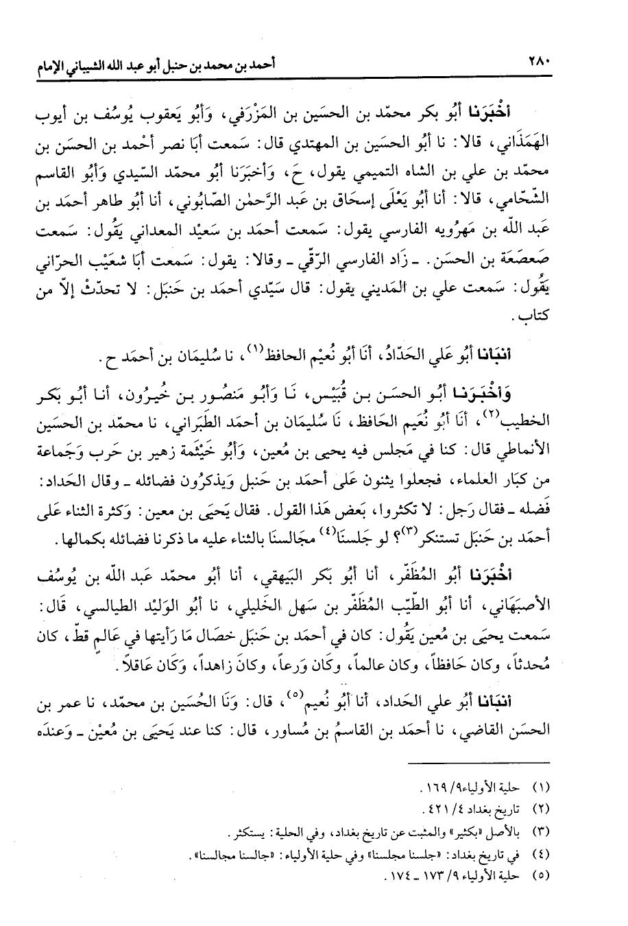 أخبرنا أبو بكر محمد بن الحسين بن المزرفي وأبو يعقوب يوسف بن أيوب الهمذاني قالا نا أبو الحسين بن المهتدي قال سمعت أبا نصر أحمد بن الحسن بن محمد بن علي بن الشاه التميمي يقول وأخبرنا أبو محمد السيدي وأبو القاسم الشحامي قالا أنا أبو يعلى إسحاق بن عبد الرحمن الصابوني أنا أبو طاهر أحمد بن عبد الله بن مهرويه الفارسي يقول سمعت أحمد بن سعيد المعداني يقول سمعت صعصعة بن الحسن زاد الفارسي الرقي وقالا يقول سمعت أبا شعيب الحراني يقول سمعت علي بن المديني يقول قال سيدي أحمد بن حنبل لا تحدث إلا من كتاب أنبأنا أبو علي الحداد أنا أبو نعيم الحافظ (1) نا سليمان بن أحمد وأخبرنا أبو الحسن بن قبيس نا وأبو منصور بن خيرون أنا أبو بكر الخطيب (2) أنا أبو نعيم الحافظ نا سليمان بن أحمد الطبراني نا محمد بن الحسين الأنماطي قال كنا في مجلس فيه يحيى بن معين وأبو خيثمة زهير بن حرب وجماعة من كبار العلماء فجعلوا يثنون على أحمد بن حنبل ويذكرون فضائله وقال الحداد فضله فقال رجل لا تكثروا بعض هذا القول فقال يحيى بن معين وكثرة الثناء على أحمد بن حنبل تستنكر (3) لو جلسنا (4) مجالسنا بالثناء عليه ما ذكرنا فضائله بكمالها أخبرنا أبو المظفر أنا أبو بكر البيهقي أنا أبو محمد عبد الله بن يوسف الأصبهاني أنا أبو الطيب المظفر بن سهل الخليلي نا أبو الوليد الطيالسي قال سمعت يحيى بن معين يقول كان في أحمد بن حنبل خصال ما رأيتها في عالم قط كان محدثا وكان حافظا وكان عالما وكان ورعا وكان زاهدا وكان عاقلا أنبأنا أبو علي الحداد أنا أبو نعيم (5) قال ونا الحسين بن محمد نا عمر بن الحسن القاضي نا أحمد بن القاسم بن مساور قال كنا عند يحيى بن معين وعنده