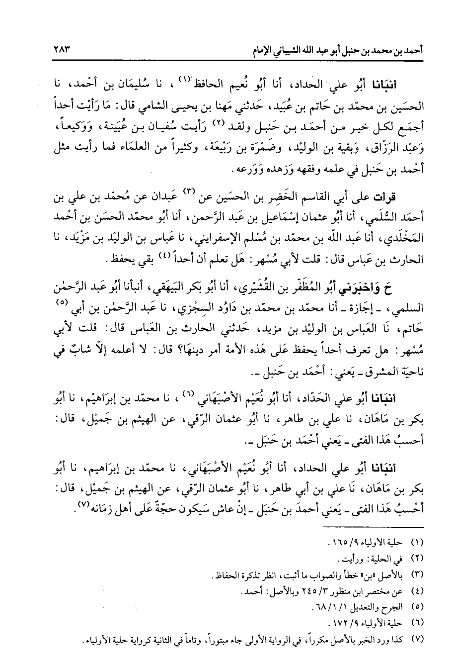أنبأنا أبو علي الحداد أنا أبو نعيم الحافظ (1) نا سليمان بن أحمد نا الحسين بن محمد بن حاتم بن عبيد حدثني مهنا بن يحيى الشامي قال ما رأيت أحدا أجمع لكل خير من أحمد بن حنبل ولقد (2) رأيت سفيان بن عيينة ووكيعا وعبد الرزاق وبقية بن الوليد وضمرة بن ربيعة وكثيرا من العلماء فما رأيت مثل أحمد بن حنبل في علمه وفقهه وزهده وورعه قرأت على أبي القاسم الخضر بن الحسين عن (3) عبدان عن محمد بن علي بن أحمد السلمي أنا أبو عثمان إسماعيل بن عبد الرحمن أنا أبو محمد الحسن بن أحمد المخلدي أنا عبد الله بن محمد بن مسلم الإسفرايني نا عباس بن الوليد بن مزيد نا الحارث بن عباس قال قلت لأبي مسهر هل تعلم أن أحدا (4) بقي يحفظ ح وأخبرني أبو المظفر بن القشيري أنا أبو بكر البيهقي أنبأنا أبو عبد الرحمن السلمي إجازة أنا محمد بن محمد بن داود السجزي نا عبد الرحمن بن أبي (5) حاتم نا العباس بن الوليد بن مزيد حدثني الحارث بن العباس قال قلت لأبي مسهر هل تعرف أحدا يحفظ على هذه الأمة أمر دينها قال لا أعلمه إلا شاب في ناحية المشرق يعني أحمد بن حنبل أنبأنا أبو علي الحداد أنا أبو نعيم الأصبهاني (6) نا محمد بن إبراهيم نا أبو بكر بن ماهان نا علي بن طاهر نا أبو عثمان الرقي عن الهيثم بن جميل قال أحسب هذا الفتى يعني أحمد بن حنبل أنبأنا أبو علي الحداد أنا أبو نعيم الأصبهاني نا محمد بن إبراهيم نا أبو بكر بن ماهان نا علي بن أبي طاهر نا أبو عثمان الرقي عن الهيثم بن جميل قال أحسب هذا الفتى يعني أحمد بن حنبل إن عاش سيكون حجة على أهل زمانه (7)