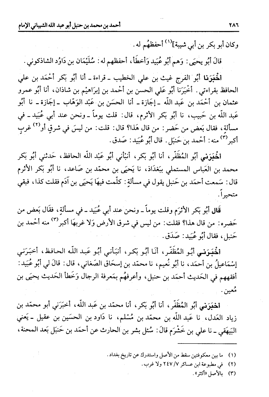 وكان أبو بكر بن أبي شيبة (1) أحفظهم له قال أبو يحيى وهم أبو عبيد وأخطأ أحفظهم له سليمان بن داود الشاذكوني أخبرنا أبو الفرج غيث بن علي الخطيب فراءة أنا أبو بكر أحمد بن علي الحافظ بقراءتي أخبرنا أبو علي الحسن بن أحمد بن إبراهيم بن شاذان أنا أبو عمرو عثمان بن أحمد بن عبد الله إجازة أنا الحسن بن عبد الوهاب إجازة نا أبو عبد الله بن حبيب نا أبو بكر الأثرم قال قلت يوما ونحن عند أبي عبيد في مسألة فقال بعض من حضر من قال هذا قال قلت من ليس في شرق أو (2) غرب أكبر (3) منه أحمد بن حنبل قال أبو عبيد صدق أخبرني أبو المظفر أنا أبو بكر أنبأني أبو عبد الله الحافظ حدثني أبو بكر محمد بن العباس المستملي ببغداذ نا يحيى بن محمد بن صاعد نا أبو بكر الأثرم قال سمعت أحمد بن حنبل يقول في مسألة كلمت فيها يحيى بن آدم فقلت كذا فبقي متحيرا قال أبو بكر الأثرم وقلت يوما ونحن عند أبي عبيد في مسألة فقال بعض من حضره من قال هذا فقلت من ليس في شرق الأرض ولا غربها أكبر (3) من أحمد بن حنبل فقال أبو عبيد صدق أخبرني أبو المظفر أنا أبو بكر أنبأني أبو عبد الله الحافظ أخبرني إسماعيل بن أحمد نا أبو نعيم نا محمد بن إسحاق الصغاني قال قال لي أبو عبيد أفقههم في الحديث أحمد بن حنبل وأعرفهم بمعرفة الرجال وخطأ الحديث يحيى بن معين أخبرني أبو المظفر أنا أبو بكر أنا محمد بن عبد الله أخبرني أبو محمد بن زياد العدل نا عبد الله بن محمد بن مسلم نا داود بن الحسين بن عقيل يعني البيهقي نا علي بن خشرم قال سئل بشر بن الحارث عن أحمد بن حنبل بعد المحنة