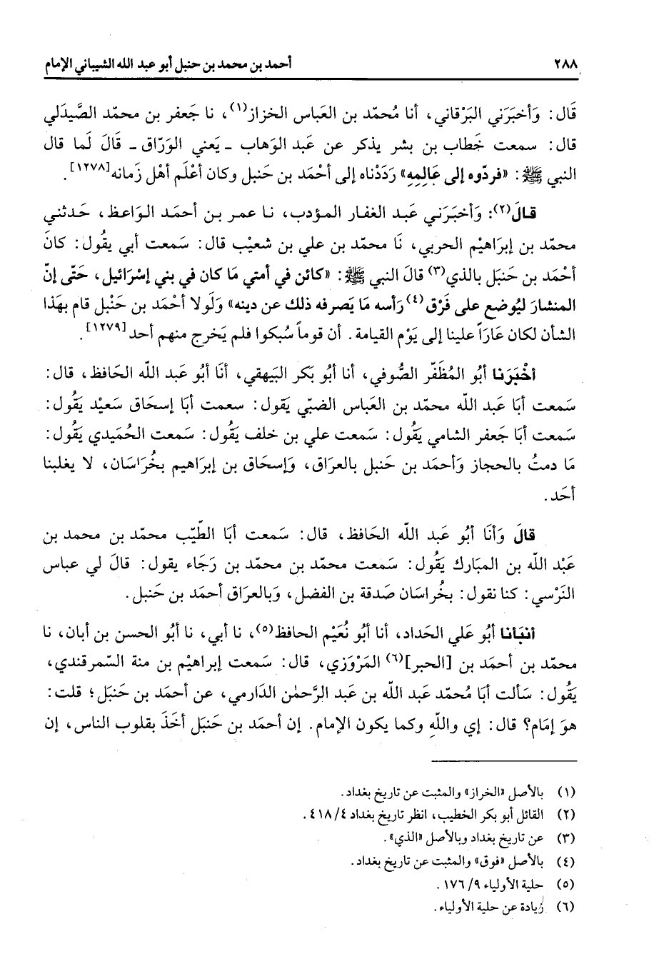 قال وأخبرني البرقاني أنا محمد بن العباس الخزاز (1) نا جعفر بن محمد الصيدلي قال سمعت خطاب بن بشر يذكر عن عبد الوهاب يعني الوراق قال لما قال النبي (صلى الله عليه وسلم) فردوه إلى عالمه رددناه إلى أحمد بن حنبل وكان أعلم أهل زمانه قال (2) وأخبرني عبد الغفار المؤدب نا عمر بن أحمد الواعظ حدثني محمد بن إبراهيم الحربي نا محمد بن علي بن شعيب قال سمعت أبي يقول كان أحمد بن حنبل بالذي (3) قال النبي (صلى الله عليه وسلم) كائن في أمتي ما كان في بني إسرائيل حتى إن المنشار ليوضع على فرق (4) رأسه ما يصرفه ذلك عن دينه ولولا أحمد بن حنبل قام بهذا الشأن لكان عارا علينا إلى يوم القيامة أن قوما سبكوا فلم يخرج منهم أحد أخبرنا أبو المظفر الصوفي أنا أبو بكر البيهقي أنا أبو عبد الله الحافظ قال سمعت أبا عبد الله محمد بن العباس الضبي يقول سمعت أبا إسحاق سعيد يقول سمعت أبا جعفر الشامي يقول سمعت علي بن خلف يقول سمعت الحميدي يقول ما دمت بالحجاز وأحمد بن حنبل بالعراق وإسحاق بن إبراهيم بخراسان لا يغلبنا أحد قال وأنا عبد الله الحافظ قال سمعت أبا الطيب محمد بن محمد بن عبد الله بن المبارك يقول سمعت محمد بن محمد بن رجاء يقول قال لي عباس النرسي كنا نقول بخراسان صدقة بن الفضل وبالعراق أحمد بن حنبل أنبأنا أبو علي الحداد أنا أبو نعيم الحافظ (5) نا أبي نا أبو الحسن بن أبان نا محمد بن أحمد بن الحبر (6) المروزي قال سمعت إبراهيم بن منة السمرقندي يقول سألت أبا محمد عبد الله بن عبد الرحمن الدارمي عن أحمد بن حنبل قلت هو إمام قال إي والله وكما يكون الإمام إن أحمد بن حنبل أخذ بقلوب الناس إن