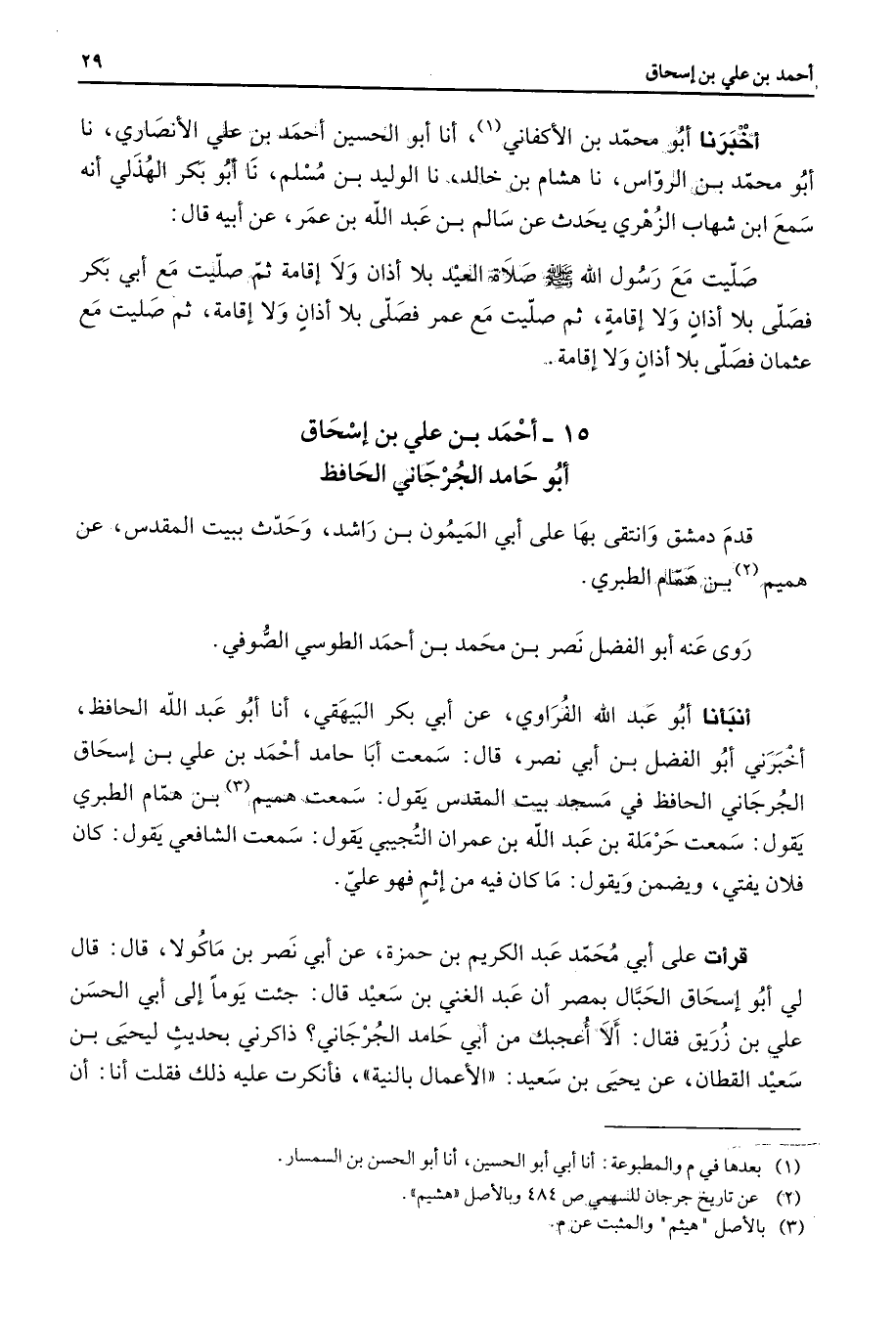 أخبرنا أبو محمد بن الأكفاني (1) أنا أبو الحسين أحمد بن علي الأنصاري نا أبو محمد بن الرواس نا هشام بن خالد نا الوليد بن مسلم نا أبو بكر الهذلي أنه سمع ابن شهاب الزهري يحدث عن سالم بن عبد الله بن عمر عن أبيه قال صليت مع رسول الله (صلى الله عليه وسلم) صلاة العيد ولا أذان ولا إقامة ثم صليت مع أبي بكر فصلى بلا أذان ولا إقامة ثم صليت مع عمر فصلى بلا أذان ة لا إقامة ثم صليت مع عثمان فصلى بلا أذان ولا إقامة 15 - أحمد بن علي بن إسحاق أبو حامد الجرجاني الحافظ قدم دمشق وانتقى بها أبي الميمون بن راشد وحدث ببيت المقدس عن هميم (2) بن همام الطبري روى عنه أبو الفضل نصر بن محمد بن أحمد الطوسي الصوفي أنبأنا أبو عبد الله الفراوي عن أبي بكر البيهقي أنا أبو عبد الله الحافظ أخبرني أبو الفضل بن أبي نصر قال سمعت أبا حامد أحمد بن علي بن إسحاق الجرجاني الحافظ في مسجد بيت المقدس يقول سمعت هميم (3) بن همام الطبري يقول سمعت حرملة بن عبد الله بن عمران التجيبي يقول سمعت الشافعي يقول كان فلان يفتي ويضمن ويقول ما كان فيه من إثم فهو علي قرأت على أبي محمد عبد الكريم بن حمزة عن أبي نصر بن ماكولا قال قال لي أبو إسحاق الحبال بمصر أن عبد الغني بن سعيد قال جئت يوما إلى أبي الحسن علي بن زريق فقال ألا أعجبك من أبي حامد الجرجاني ذاكرني بحديث ليحيى بن سعيد القطان عن يحيى بن سعيد الأعمال بالنية فأنكرت عليه ذلك فقلت أنا أن