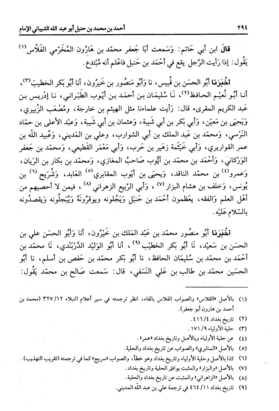 قال ابن أبي حاتم وسمعت أبا جعفر محمد بن هارون المخرمي الفلاس (1) يقول إذا رأيت الرجل يقع في أحمد بن حنبل فاعلم أنه مبتدع أخبرنا أبو الحسن بن قبيس نا وأبو منصور بن خيرون أنا أبو بكر الخطيب (3) أنا أبو نعيم الحافظ (2) نا سليمان بن أحمد بن أيوب الطبراني نا إدريس بن عبد الكريم المقرئ قال رأيت علماءنا مثل الهيثم بن خارجة ومصعب الزبيري ويحيى بن معين وأبي بكر بن أبي شيبة وعثمان بن أبي شيبة وعبد الأعلى بن حماد النرسي ومحمد بن عبد الملك بن أبي الشوارب وعلي بن المديني وعبيد الله بن عمر القواريري وأبي خيثمة زهير بن حرب وأبي معمر القطيعي ومحمد بن جعفر الوركاني وأحمد بن محمد بن أيوب صاحب المغازي ومحمد بن بكار بن الريان وعمرو (4) بن محمد الناقد ويحيى بن أيوب المقابري (5) العابد وشريح (6) بن يونس وخلف بن هشام البزار (7) وأبي الربيع الزهراني (8) فيمن لا أحصيهم من أهل العلم والفقه يعظمون أحمد بن حنبل ويجعونه ويوقرونه ويبجلونه ويقصدونه بالسلام عليه أخبرنا أبو منصور محمد بن عبد الملك بن خيرون أنا وأبو الحسن علي بن الحسن بن سعيد نا أبو بكر الخطيب (9) أنا أبو الوليد الدربندي نا محمد بن أحمد بن محمد بن سليمان الحافظ نا أبو بكر محمد بن حفص بن أسلم نا أبو الحسين محمد بن طالب بن علي النسفي قال سمعت صالح بن محمد يقول