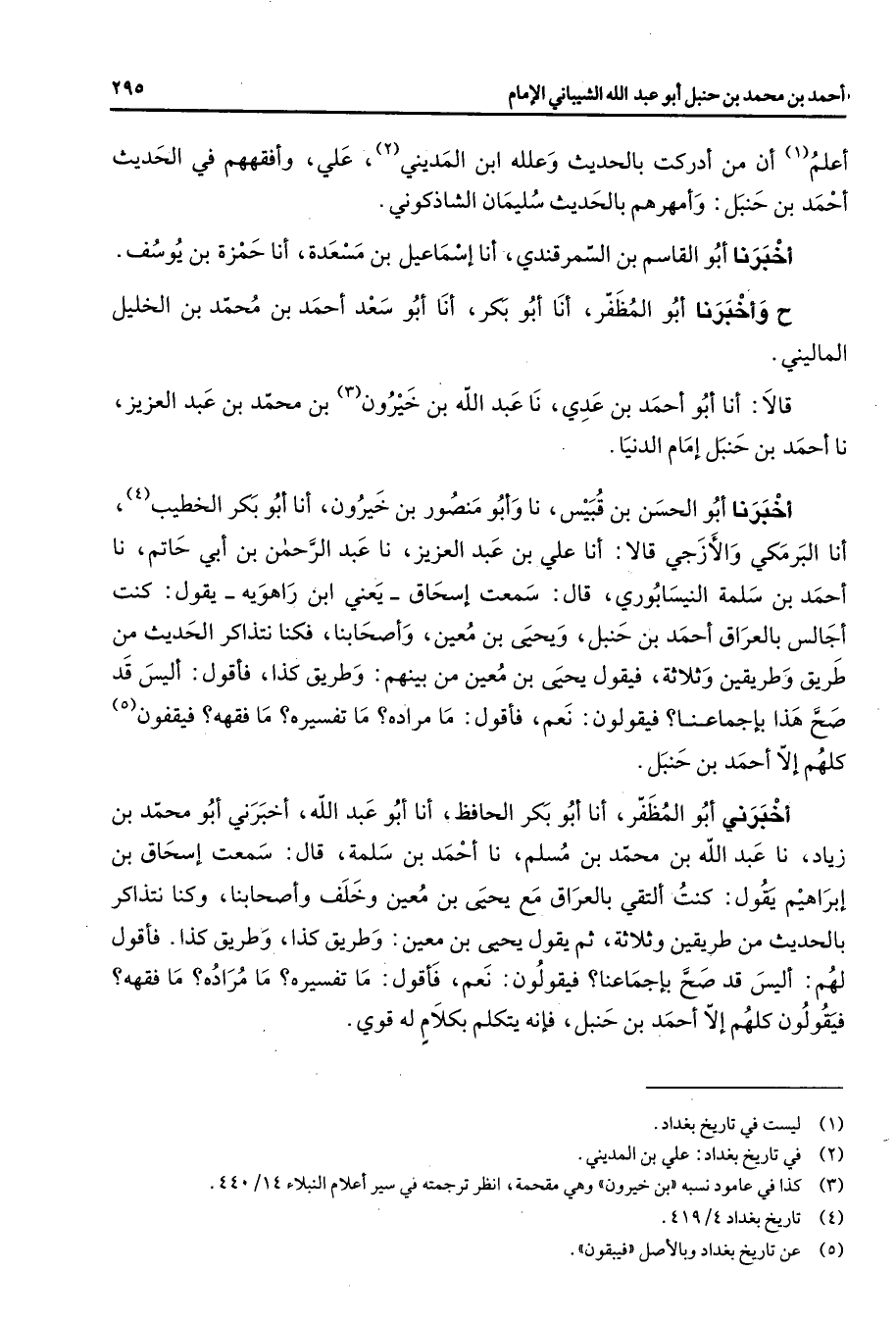 أعلم (1) أن من أدركت بالحديث وعلله ابن المديني (2) علي وأفقههم في الحديث أحمد بن حنبل وأمرهم بالحديث سليمان الشاذكوني أخبرنا أبو القاسم بن السمرقندي أنا إسماعيل بن مسعدة أنا حمزة بن يوسف ح وأخبرنا أبو المظفر أنا أبو بكر أنا سعد أحمد بن محمد بن الخليل الماليني قالا أنا أبو أحمد بن عدي نا عبد الله بن خيرون (3) بن محمد بن عبد العزيز نا أحمد بن حنبل إمام الدنيا أخبرنا أبو الحسن بن قبيس نا وأبو منصور بن خيرون أنا أبو بكر الخطيب (4) أنا البرمكي والأزجي قالا أنا علي بن عبد العزيز نا عبد الرحمن بن أبي حاتم نا أحمد بن سلمة النيسابوري قال سمعت إسحاق يعني ابن راهوية يقول كنت أجالس بالعراق أحمد بن حنبل ويحيى بن معين وأصحابنا فكنا نتذاكر الحديث من طريق وطريقين وثلاثة فيقول يحيى بن معين من بينهم وطريق كذا فأقول أليس قد صح هذا بإجماعنا فيقولون نعم فأقول ما مراده ما تفسيره ما فقهه فيقفون (5) كلهم إلا أحمد بن حنبل أخبرني أبو المظفر أنا أبو بكر الحافظ أنا أبو عبد الله أخبرني أبو محمد بن زياد نا عبد الله بن محمد بن مسلم نا أحمد بن سلمة قال سمعت إسحاق بن إبراهيم يقول كنت التقي بالعراق مع يحيى بن معين وخلف وأصحابنا وكنا نتذاكر بالحديث من طريقين وثلاثة ثم يقول يحيى بن معين وطريق كذا وطريق كذا فأقول لهم أليس قد صح بإجماعنا فيقولون نعم فأقول ما تفسيره ما مراده ما فقهه فيقولون كلهم إلا أحمد بن حنبل فإنه يتكلم بكلام له قوي