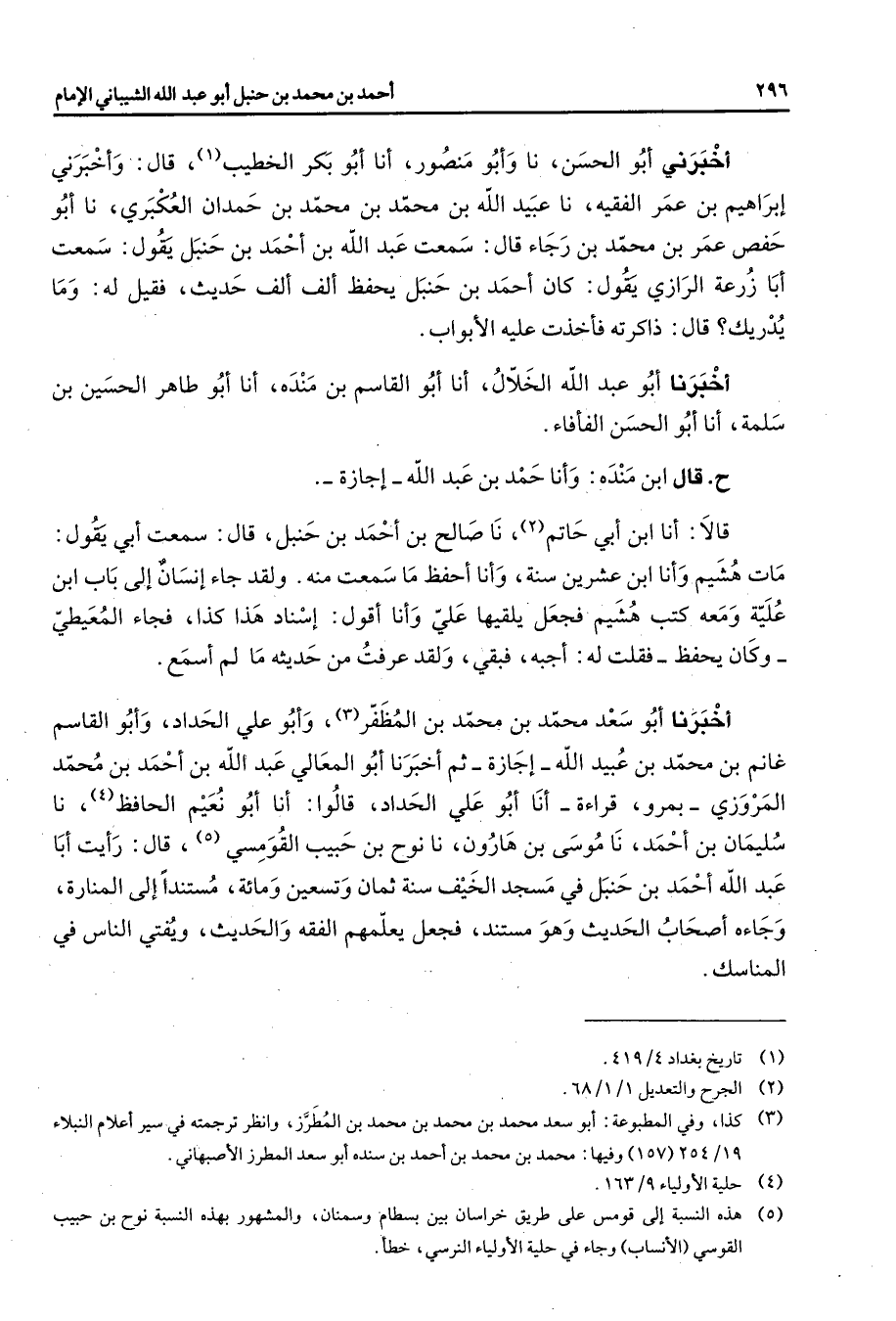 أخبرني أبو الحسن نا وأبو منصور أنا أبو بكر الخطيب (1) قال وأخبرني إبراهيم بن عمر الفقيه نا عبيد الله بن محمد بن محمد بن حمدان العبكري نا أبو حفص عمر بن محمد بن رجاء قال سمعت عبد الله بن أحمد بن حنبل يقول سمعت أبا زرعة الرازي يقول كان أحمد بن حنبل يحفظ ألف ألف حديث فقيل له وما يدريك قال ذاكرته فأخذت عليه الأبواب أخبرنا أبو عبد الله الخلال أنا أبو القاسم بن مندة أنا أبو طاهر الحسين بن سلمة أنا أبو الحسن الفأفاء ح قال ابن مندة وأنا حمد بن عبد الله إجازة قالا أنا ابن أبي حاتم (2) نا صالح بن أحمد بن حنبل قال سمعت أبي يقول مات هشيم وأنا ابن عشرين سنة وأنا أحفظ ما سمعت منه ولقد جاء إنسان إلى باب ابن علية ومعه كتب هشيم فجعل يلقيها علي وأنا أقول إسناد هذه كذا فجاء المعيطي وكان يحفظ فقلت له أجبه فبقي ولقد عرفت من حديثه ما لم أسمع أخبرنا أبو سعد محمد بن محمد بن المظفر (3) وأبو علي الحداد وأبو القاسم غانم بن محمد بن عبيد الله إجازة ثم أخبرنا أبو المعالي عبد الله بن أحمد بن محمد المروزي بمرو قراءة أنا أبو علي الحداد قالوا أنا أبو نعيم الحافظ (4) نا سليمان بن أحمد نا موسى بن هارون نا نوح بن حبيب القومسي (5) قال رأيت أبا عبد الله أحمد بن حنبل في مسجد الخيف سنة ثمان وتسعين ومائة مستندا إلى المنارة وجاءه أصحاب الحديث وهو مستند فجعل يعلمهم الفقه والحديث ويفتي الناس في المناسك
