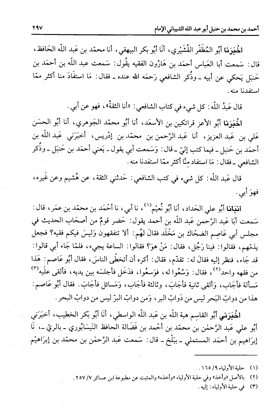 أخبرنا أبو المظفر القشيري أنا أبو بكر البيهقي أنا محمد بن عبد الله الحافظ قال سمعت أبا العباس أحمد بن هارون الفقيه يقول سمعت عبد الله بن أحمد بن حنبل يحكي عن أبيه وذكر الشافعي رحمه الله عنده فقال ما استفاد منا أكثر مما استفدنا منه قال عبد الله كل شئ في كتاب الشافعي أنا الثقة فهو عن أبي أخبرنا أبو الأعز قراتكين بن الأسعد أنا أبو محمد الجوهري أنا أبو الحسن علي بن عبد العزيز أنا عبد الرحمن بن محمد بن إدريس أخبرني عبد الله بن أحمد بن حنبل فيما كتب إلي قال وسمعت أبي يقول يعني أحمد بن حنبل وذكر الشافعي فقال ما استفاد منا أكثر مما استفدنا منه قال عبد الله كل شئ في كتب الشافعي حدثني الثقة عن هشيم وعن غيره فهو أبي أنبأنا أبو علي الحداد أنا أبو نعيم (1) نا أبي نا أحمد بن محمد بن عمر قال سمعت أبا عبد الرحمن عبد الله بن أحمد يقول حضر قوم من أصحاب الحديث في مجلس أبي عاصم الضحاك بن مخلد فقال لهم ألا تتفقهون وليس فيكم فقيه فجعل يذمهم فقالوا فينا رجل فقال من هو فقالوا الساعة يجئ فلما جاء أبي قالوا قد جاء فنظر إليه فقال له تقدم فقال أكره أن أتخطى الناس فقال أبو عاصم هذا من فقهه واحد (2) فقال وسعوا له فوسعوا فدخل فأجلسه بين يديه فألقى عليه (3) مسألة فأجاب وألقى ثانية فأجاب وثالثة فأجاب ومسائل فأجاب فقال أبو عاصم هذا من دواب البحر ليس من دواب البر ومن دواب البر ليس من دواب البحر أخبرني أبو القاسم هبة الله بن عبد الله الواسطي أنا أبو بكر الخطيب أخبرني أبو علي عبد الرحمن بن محمد بن أحمد بن فضالة الحافظ النيسابوري بالري نا إبراهيم بن أحمد المستملي ببلخ قال سمعت عبد الرحمن بن محمد بن إبراهيم