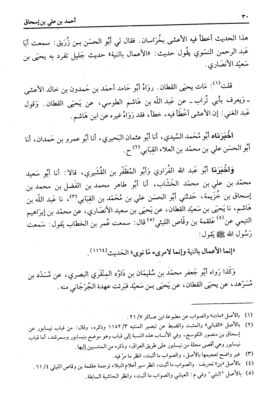 هذا الحديث أخطأ فيه الأعشى بخراسان فقال لي أبو الحسن بن زريق سمعت أبا عبد الرحمن النسوي يقول حديث الأعمال بالنية حديث جليل تفرد به يحيى بن سعيد الأنصاري قلت (1) مات يحيى القطان رواه أبو حامد بن حمدون بن خالد الأعشى ويعرف بأبي تراب عن عبد الله بن هاشم الطوسي عن يحيى القطان وقول عبد الغني إن الأعشى أخطأ فيه خطأ فقد رواه غيره عن ابن هاشم أخبرناه أبو محمد السيدي أنا أبو عثمان البحيري أنا أبو عمرو بن حمدان أنا أبو الحسن علي بن محمد بن العلاء القبابي (2) وأخبرنا أبو عبد الله الفراوي وأبو المظفر بن القشيري قالا أنا أبو سعيد محمد بن علي بن محمد الخشاب أنا أبو طاهر محمد بن الفضل بن محمد بن إسحاق بن خزيمة حدثني أبو الحسن علي بن محمد القبابي (3) نا عبد الله بن هاشم نا يحيى بن سعيد القطان عن يحيى بن سعيد الأنصاري عن محمد بن إبراهيم التيمي عن (4) علقمة بن وقاص الليثي (5) قال سمعت عمر بن الخطاب يقول سمعت رسول الله (صلى الله عليه وسلم) يقول إنما الأعمال بالنية وإنما لامرئ ما نوى الحديث