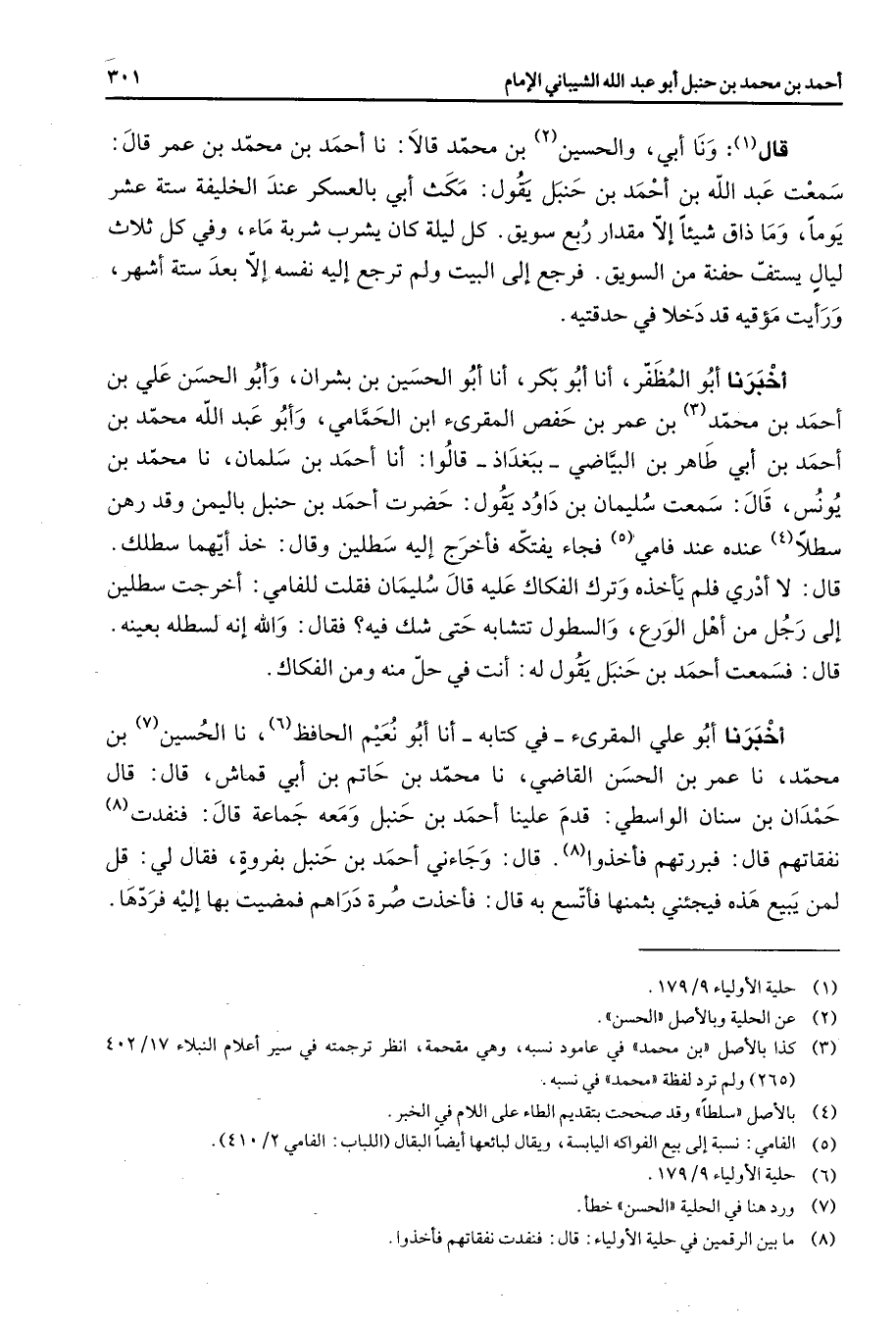 وقال (1) ونا أبي والحسين (2) بن محمد قالا نا أحمد بن محمد بن عمر قال سمعت عبد الله بن أحمد بن حنبل يقول مكث أبي بالعسكر عند الخليفة ستة عشر يوما وما ذاق شيئا إلا مقدار ربع سويق كل ليلة كان يشرب شربة ماء وفي كل ثلاث ليال يستف حفنة من السويق فرجع إلى البيت ولم ترجع إليه نفسه إلا بعد ستة أشهر ورأيت مؤقيه قد دخلا في حدقتيه أخبرنا أبو المظفر أنا أبو بكر أنا أبو الحسين بن بشران وأبو الحسن علي بن أحمد بن محمد (3) بن عمر بن حفص المقرئ ابن الحمامي وأبو عبد الله محمد بن أحمد بن أبي طاهر بن البياضي ببغداذ قالوا أنا أحمد بن سلمان نا محمد بن يونس قال سمعت سليمان بن داود يقول حضرت أحمد بن حنبل باليمن وقد رهن سطلا (4) عنده عند فامي (5) فجاء يفتكه فأخرج إليه سطلين وقال خذ أيهما سطلك قال لا أدري فلم يأخذه وترك الفكاك عليه قال سليمان فقلت للفامي أخرجت سطلين إلى رجل من أهل الورع والسطول تتشابه حتى شك فيه فقال والله إنه لسطله بعينه قال فسمعت أحمد بن حنبل يقول له أنت في حل منه ومن الفكاك أخبرنا أبو علي المقرئ في كتابه أنا أبو نعيم الحافظ (6) نا الحسين (7) بن محمد نا عمر بن الحسن القاضي نا محمد بن حاتم بن أبي قماش قال قال حمدان بن سنان الواسطي قدم علينا أحمد بن حنبل ومعه جماعة قال فنفدت (8) نفقاتهم قال فبررتهم فأخذوا قال وجاءني أحمد بن حنبل بفروة فقال لي قل لمن يبيع هذه فيجئني بثمنها فأتسع به قال فأخذت صرة دراهم فمضيت بها إليه فردها