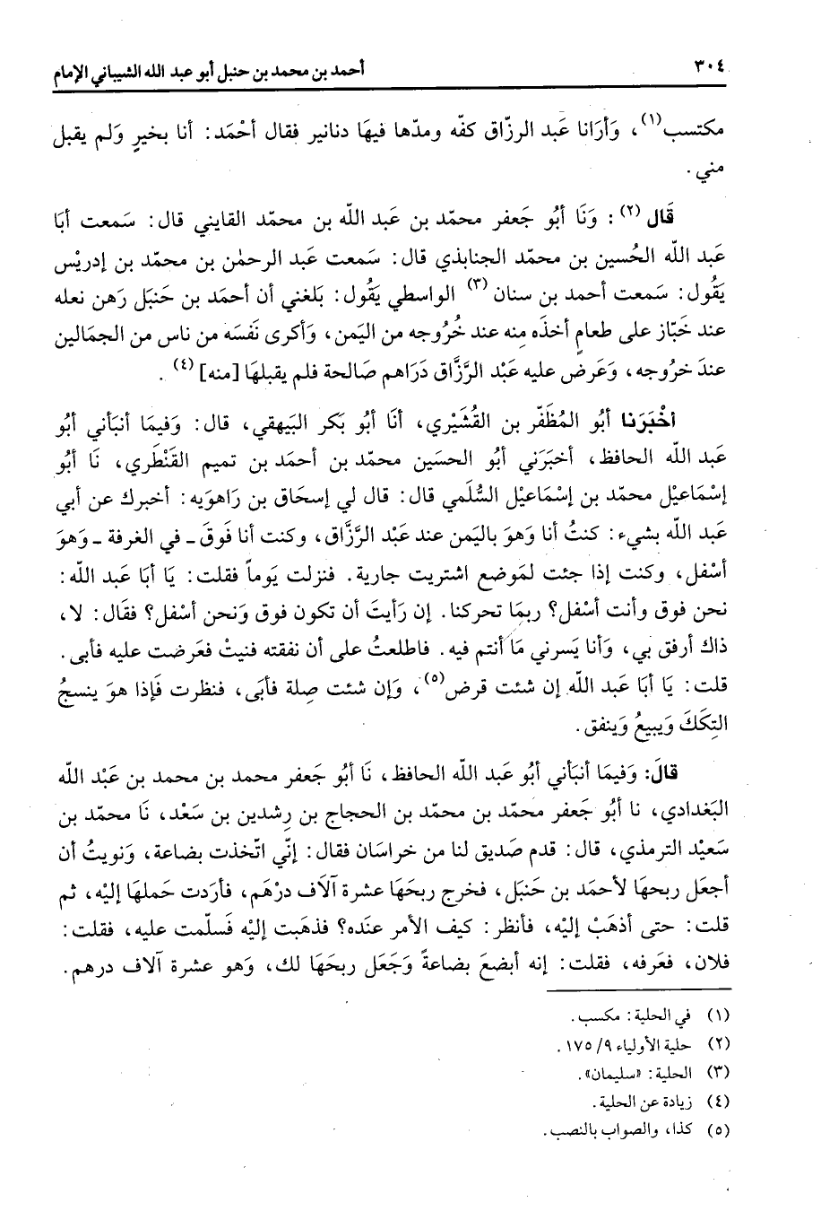 مكتسب (1) وأرانا عبد الرزاق كفه ومدها فيها دنانير فقال أحمد أنا بخير ولم يقبل مني قال (2) ونا أبو جعفر محمد بن عبد الله بن محمد القايني قال سمعت أبا عبد الله الحسين بن محمد الجنابذي قال سمعت عبد الرحمن بن محمد بن إدريس يقول سمعت أحمد بن سنان (3) الواسطي يقول بلغني أن أحمد بن حنبل رهن نعله عند خباز على طعام أخذه منه عند خروجه من اليمن وأكرى نفسه من ناس من الجمالين عند خروجه وعرض عليه عبد الرزاق دراهم صالحة فلم يقبلها منه (4) أخبرنا أبو المظفر بن القشيري أنا أبو بكر البيهقي قال وفيما أنبأني أبو عبد الله الحافظ أخبرني أبو الحسين محمد بن أحمد بن تميم القنطري نا أبو إسماعيل محمد بن إسماعيل السلمي قال قال لي إسحاق بن راهوية أخبرك عن أبي عبد الله بشئ كنت أنا وهو باليمن عند عبد الرزاق وكنت أنا فوق في الغرفة وهو أسفل وكنت إذا جئت لموضع اشتريت جارية فنزلت يوما فقلت يا أبا عبد الله نحن فوق وأنت أسفل ربما تحركنا إن رأيت أن تكون فوق ونحن أسفل فقال لا ذاك أرفق بي وأنا يسرني ما أنتم فيه فاطلعت على أن نفقته فنيت فعرضت عليه فأبى قلت يا أبا عبد الله إن شئت قرض (5) وإن شئت صلة فأبى فنظرت فإذا هو ينسج التكك ويبيع وينفق قال وفيما أنبأني أبو عبد الله الحافظ نا أبو جعفر محمد بن محمد بن عبد الله البغدادي نا أبو جعفر محمد بن محمد بن الحجاج بن رشدين بن سعد نا محمد بن سعيد الترمذي قال قدم صديق لنا من خراسان فقال إني اتخذت بضاعة ونويت أن أجعل ربحها لأحمد بن حنبل فخرج ربحها عشرة آلاف درهم فأردت حملها إليه ثم قلت حتى أذهب إليه فأنظر كيف الأمر عنده فذهبت إليه فسلمت عليه فقلت فلان فعرفه فقلت إنه أبضع بضاعة وجعل ربحها لك وهو عشرة آلاف درهم