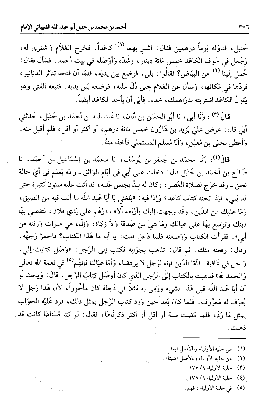 حنبل فناوله يوما درهمين فقال اشتر بهما (1) كاغدا فخرج الغلام واشترى له وجعل في جوف الكاغد خمس مائة دينار وشده وأوصله في بيت أحمد فسأل فقال حمل إلينا (2) من البياض فقالوا بلى فوضع بين يديه فلما أن فتحه تناثر الدنانير فردها في مكانها وسأل عن الغلام حتى دل عليه فوضعه بين يديه فتبعه الفتى وهو يقول الكاغد اشتريته بدراهمك خذه فأبى أن يأخذ الكاغد أيضا قال (3) ونا أبي نا أبو الحسن بن أبان نا عبد الله بن أحمد بن حنبل حدثني أبي قال عرض علي يزيد بن هارون خمس مائة درهم أو أكثر أو أقل فلم أقبل منه وأعطى يحيى بن معين وأبا مسلم المستملي فأخذا منه قال (4) ونا محمد بن جعفر بن يوسف نا محمد بن إسماعيل بن أحمد نا صالح بن أحمد بن حنبل قال دخلت على أبي في أيام الواثق والله يعلم في أي حالة نحن وقد خرج لصلاة العصر وكان له لبد يجلس عليه قد أتت عليه سنون كثيرة حتى قد بلي فإذا تحته كتاب كاغد وإذا فيه بلغني يا أبا عبد الله ما أنت فيه من الضيق وما عليك من الدين وقد وجهت إليك بأربعة آلاف درهم على يدي فلان لتقضي بها دينك وتوسع بها على عيالك وما هي من صدقة ولا زكاة وإنما هي ميراث ورثته من أبي فقرأت الكتاب ووضعته فلما دخل قلت يا أبة ما هذا الكتاب فاحمر وجهه وقال رفعته منك ثم قال تذهب بجوابه فكتب إلى الرجل وصل كتابك إلي ونحن في عافية فأما الدين فإنه لرجل لا يرهقنا وأما عيالنا فإنهم (5) في نعمة الله تعالى والحمد لله فذهبت بالكتاب إلى الرجل الذي كان أوصل كتاب الرجل قال ويحك لو أن أبا عبد الله قبل هذا الشئ ورمى به مثلا في دجلة كان مأجورا لأن هذا رجل لا يعرف له معروف فلما كان بعد حين ورد كتاب الرجل بمثل ذلك فرد عليه الجواب بمثل ما رد فلما مضمت سنة أو أقل أو أكثر ذكرناها فقال لو كنا قبلناها كانت قد ذهبت