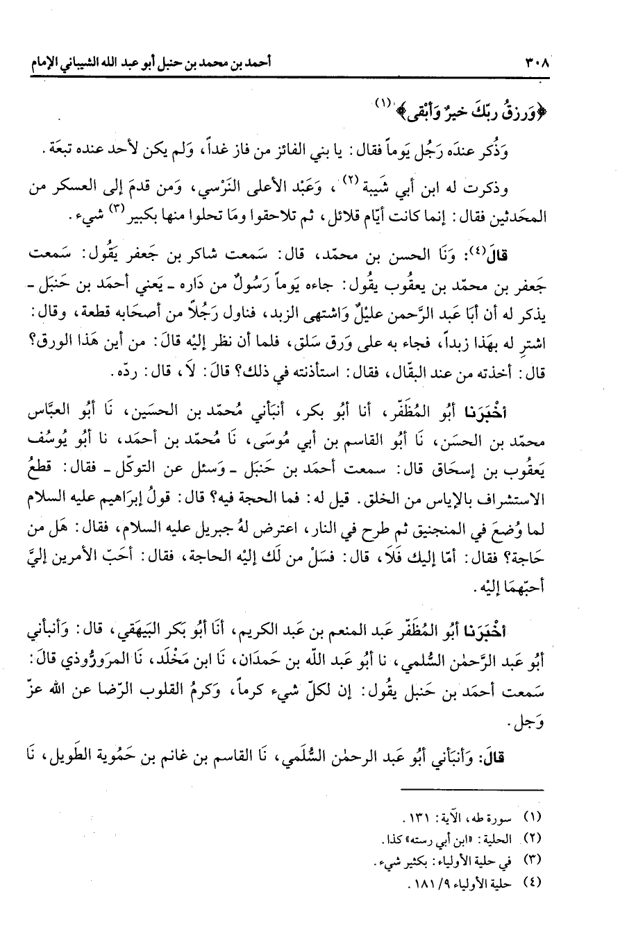 " ورزق ربك خير وأبقى " (1) وذكر عنده رجل يوما فقال يا بني الفائز من فاز غدا ولم يكن لأحد عنده تبعة وذكرت له ابن أبي شيبة (2) وعبد الأعلى النرسي ومن قدم إلى العسكر من المحدثين فقال إنما كانت أيام قلائل ثم تلاحقوا وما تحلوا منها بكبير (3) شئ قال (4) ونا الحسن بن محمد قال سمعت شاكر بن جعفر يقول سمعت جعفر بن محمد بن يعقوب يقول جاءه يوما رسول من داره يعني أحمد بن حنبل يذكر له أن أبا عبد الرحمن عليل واشتهى الزبد فناول رجلا من أصحابه قطعة وقال اشتر له بهذا زبدا فجاء به على ورق سلق فلما أن نظر إليه قال من أين هذا الورق قال أخذته من عند البقال فقال استأذنته في ذلك قال لا قال رده أخبرنا أبو المظفر أنا أبو بكر أنبأني محمد بن الحسين نا أبو العباس محمد بن الحسن نا أبو القاسم بن أبي موسى نا محمد بن أحمد نا أبو يوسف يعقوب بن إسحاق قال سمعت أحمد بن حنبل وسئل عن التوكل فقال قطع الاستشراف بالإياس من الخلق قيل له فما الحجة فيه قال قول إبراهيم عليه السلام لما وضع في المنجنيق ثم طرح في النار اعترض له جبريل عليه السلام فقال هل من حاجة فقال أما إليك فلا قال فسل من لك إليه الحاجة فقال أحب الأمرين إلي أحبهما إليه أخبرنا أبو المظفر عبد المنعم بن عبد الكريم أنا أبو بكر البيهقي قال وأنبأني أبو عبد الرحمن السلمي نا أبو عبد الله بن حمدان نا ابن مخلد نا المروروذي قال سمعت أحمد بن حنبل يقول إن لكل شئ كرما وكرم القلوب الرضا عن الله عز وجل قال وأنبأني أبو عبد الرحمن السلمي نا القاسم بن غانم بن حموية الطويل نا