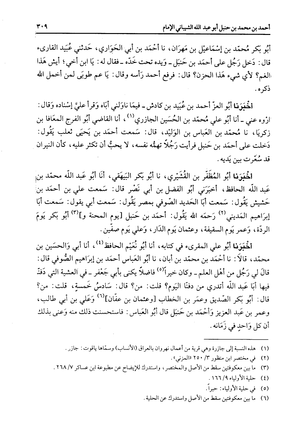 أبو بكر محمد بن إسماعيل بن مهران نا أحمد بن أبي الحواري حدثني عبيد القارئ قال دخل رجل على أحمد بن حنبل ويده تحت خده فقال له يا ابن أخي أيش هذا الغم لأي شئ هذا الحزن قال فرفع أحمد رأسه وقال يا عم طوبى لمن أخمل الله ذكره أخبرنا أبو العز أحمد بن عبيد بن كادش فيما ناولني أباه وقرأ علي إسناده وقال اروه عني أنا أبو علي محمد بن الحسين الجازري (1) أنا القاضي أبو الفرج المعافا بن زكريا نا محمد بن العباس بن الوليد قال سمعت أحمد بن يحيى ثعلب يقول دخلت على أحمد بن حنبل فرأيت رجلا تهمه نفسه لا يحب أن تكثر عليه كأن النيران قد سعرت بين يديه أخبرنا أبو المظفر بن القشيري نا أبو بكر البيهقي أنا أبو عبد الله محمد بن عبد الله الحافظ أخبرني أبو الفضل بن أبي نصر قال سمعت علي بن أحمد بن حشيش يقول سمعت أبا الحديد الصوفي بمصر يقول سمعت أبي يقول سمعت أبا إبراهيم المديني (2) رحمه الله يقول أحمد بن حنبل يوم المحنة و (3) أبو بكر يوم الردة وعمر يوم السقيفة وعثمان يوم الدار وعلي يوم صفين أخبرنا أبو علي المقرئ في كتابه أنا أبو نعيم الحافظ (4) أنا أبي والحسين بن محمد قالا نا أحمد بن محمد بن أبان نا أبو العباس أحمد بن إبراهيم الصوفي قال قال لي رجل من أهل العلم وكان خيرا (5) فاضلا يكنى بأبي جعفر في العشية التي دفن فيها أبا عبد الله أتدري من دفنا اليوم قلت من قال سادس خمسة قلت من قال أبو بكر الصديق وعمر بن الخطاب وعثمان بن عفان (6) وعلي بن أبي طالب وعمر بن عبد العزيز وأحمد بن حنبل قال أبو العباس فاستحسنت ذلك منه وعنى بذلك أن كل واحد في زمانه