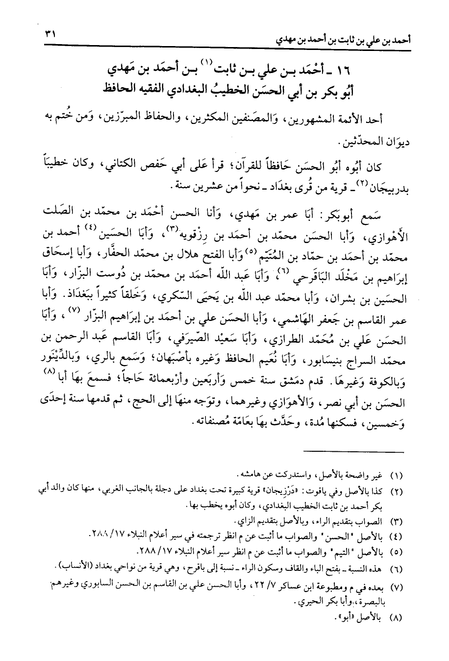 16 - أحمد بن علي بن ثابت (1) بن أحمد بن مهدي أبو بكر بن أبي الحسن الخطيب البغدادي الفقيه الحافظ أحد الأئمة المشهورين والمصنفين المكثرين والحفاظ المبرزين ومن ختم به ديوان المحدثين كان أبوه أبو الحسن حافظا للقرآن قرأ على أبي حفص الكتاني وكان خطيبا بدربيجان (2) قرية من قرى بغداد نحوا من عشرين سنة سمع أبو بكر أبا عمر بن مهدي وأنا الحسن أحمد بن محمد بن الصلت الأهوازي وابا الحسن محمد بن أحمد بن رزقويه (3) وأبا الحسين (4) أحمد بن محمد بن أحمد بن حماد بن المتيم (5) وأبا الفتح هلال بن محمد الحفار وأبا إسحاق إبراهيم بن مخلد الباقرحي (6) وأبا عبد الله أحمد بن محمد بن دوست البزار وأبا الحسين بن بشران وأبا محمد عبد الله بن يحيى السكري وخلقا كثيرا ببغداذ وأبا عمر القاسم بن جعفر الهاشمي وأبا الحسن علي بن أحمد بن إبراهيم البزار (7) وأبا الحسن علي بن محمد الطرازي وأبا سعيد الصيرفي وأبا القاسم عبد الرحمن بن محمد السراج بنيسابور وأبا نعيم الحافظ وغيره بأصبهان وسمع بالري وبالدينور وبالكوفة وغيرها قدم دمشق سنة خمس وأربعين وأربعمائة حاجا فسمع بها أبا (8) الحسن بن أبي نصر والأهوازي وغيرهما وتوجه منها إلى الحج ثم قدمها سنة إحدى وخمسين فسكنها مدة وحدث بها بعامة مصنفاته