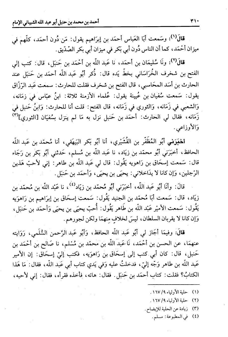 قال (1) وسمعت أبا العباس أحمد بن إبراهيم يقول من دون أحمد كلهم في ميزان أحمد كما أن الناس دون أبي بكر في ميزان أبي بكر الصديق قال (2) ونا سليمان بن أحمد نا عبد الله بن أحمد بن حنبل قال كتب إلي الفتح بن شخرف الخراساني بخط يده قال ذكر أبو عبد الله أحمد بن حنبل عند الحارث بن أسد المحاسبي قال الفتح بن شخرف فقلت للحارث سمعت عبد الرزاق يقول سمعت سفيان بن عيينة يقول علماء الأزمنة ثلاثة ابن عباس في زمانه والشعبي في زمانه والثوري في زمانه قال الفتح قلت أنا للحارث وابن حنبل في زمانه فقال لي الحارث أحمد بن حنبل نزل به ما لم ينزل بسفيان الثوري (3) والأوزاعي أخبرني أبو المظفر بن القشيري أنا أبو بكر البيهقي أنا محمد بن عبد الله الحافظ أخبرني أبو محمد بن زياد نا عبد الله بن مسلم حدثني أبو بكر بن رجاء قال سمعت إسحاق بن راهوية يقول قال لي عبد الله بن طاهر إني لأحب هذين الرجلين وإن كانا لا يداخلاني يحيى بن يحيى وأحمد بن حنبل قال وأنا أبو عبد الله أخبرني أبو محمد بن زياد (4) نا عبد الله بن محمد بن زياد قال سمعت أبا محمد بن الجنيد يقول سمعت إسحاق بن إبراهيم بن راهوية يقول سمعت الأمير عبد الله بن طاهر يقول أحب يحيى بن يحيى وأحمد بن حنبل وإن كانا لا يقربان السلطان ليس لخلاف منهما ولكن لجورهم قال وفيما أجاز لي أبو عبد الله الحافظ وأبو عبد الرحمن السلمي روايته عنهما عن الحسن بن أحمد نا عبد الله بن محمد بن مسلم نا صالح بن أحمد بن حنبل قال كان أبي كتب إلى إسحاق بن راهوية فكتب إلي إسحاق إن الأمير عبد الله بن طاهر وجه إلي فدخلت عليه وفي يدي كتاب أبي عبد الله فقال ما هذا الكتاب فقلت كتاب أحمد بن حنبل فقال هاته فأخذه فقرأه فقال إني لأحبه