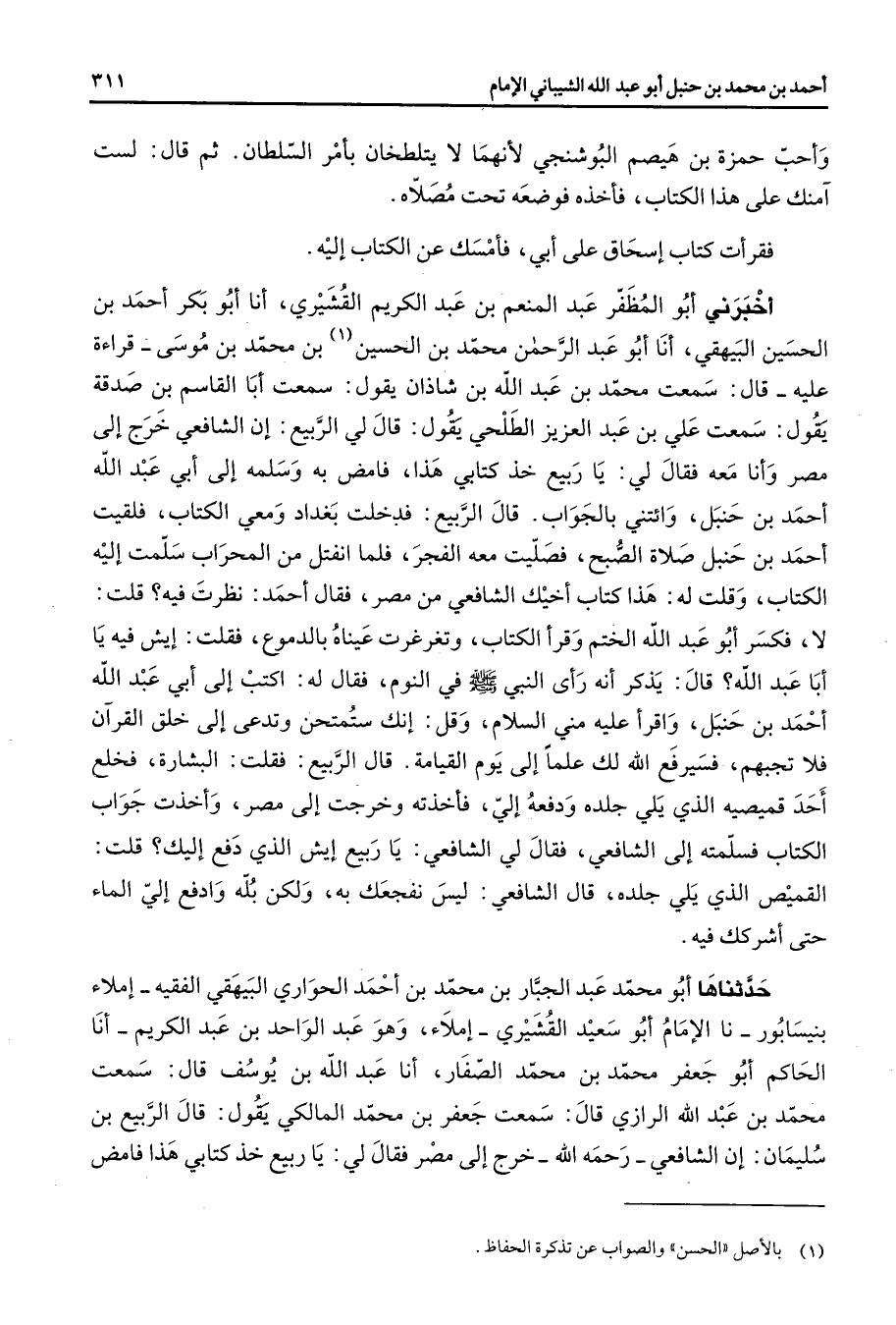 وأحب حمزة بن هيصم البوشنجي لأنهما لا يتلطخان بأمر السلطان ثم قال لست آمنك على هذا الكتاب فأخذه فوضعه تحت مصلاه فقرأت كتاب إسحاق على أبي فأمسك عن الكتاب إليه أخبرني أبو المظفر عبد المنعم بن عبد الكريم القشيري أنا أبو بكر أحمد بن الحسين البيهقي أنا أبو عبد الرحمن محمد بن الحسين (1) بن محمد بن موسى قراءة عليه قال سمعت محمد بن عبد الله بن شاذان يقول سمعت أبا القاسم بن صدقة يقول سمعت علي بن عبد العزيز الطلحي يقول قال لي الربيع إن الشافعي خرج إلى مصر وأنا معه فقال لي يا ربيع خذ كتابي هذا فامض به وسلمه إلى أبي عبد الله أحمد بن حنبل وائتني بالجواب قال الربيع فدخلت بغداد ومعي الكتاب فلقيت أحمد بن حنبل صلاة الصبح فصليت معه الفجر فلما انفتل من المحراب سلمت إليه الكتاب وقلت له هذا كتاب أخيك الشافعي من مصر فقال أحمد نظرت فيه قلت لا فكسر أبو عبد الله الختم وقرأ الكتاب وتغرغرت عيناه بالدموع فقلت إيش فيه يا أبا عبد الله قال يذكر أنه رأى النبي (صلى الله عليه وسلم) في النوم فقال له اكتب إلى أبي عبد الله أحمد بن حنبل واقرأ عليه مني السلام وقل إنك ستمتحن وتدعى إلى خلق القرآن فلا تجبهم فسيرفع الله لك علما إلى يوم القيامة قال الربيع فقلت البشارة فخلع أحد قميصيه الذي يلي جلده ودفعه إلي فأخذته وخرجت إلى مصر وأخذت جواب الكتاب فسلمته إلى الشافعي فقال لي الشافعي يا ربيع إيش الذي دفع إليك قلت القميص الذي يلي جلده قال الشافعي ليس نفجعك به ولكن بله وادفع إلي الماء حتى أشركك فيه حدثناها أبو محمد عبد الجبار بن محمد بن أحمد الحواري البيهقي الفقيه إملاء بنيسابور نا الإمام أبو سعيد القشيري إملاء وهو عبد الواحد بن عبد الكريم أنا الحاكم أبو جعفر محمد بن محمد الصفار أنا عبد الله بن يوسف قال سمعت محمد بن عبد الله الرازي قال سمعت جعفر بن محمد المالكي يقول قال الربيع بن سليمان إن الشافعي رحمه الله خرج إلى مصر فقال لي يا ربيع خذ كتابي هذا فامض