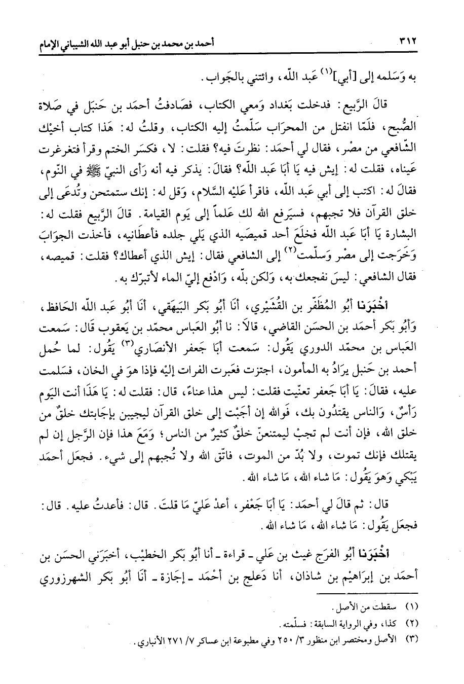 به وسلمه إلى أبي (1) عبد الله وائتني بالجواب قال الربيع فدخلت بغداد ومعي الكتاب فصادفت أحمد بن حنبل في صلاة الصبح فلما انفتل من المحراب سلمت إليه الكتاب وقلت له هذا كتاب أخيك الشافعي من مصر فقال لي أحمد نظرت فيه فقلت لا فكسر الختم وقرأ فتغرغرت عيناه فقلت له إيش فيه يا أبا عبد الله فقال يذكر فيه أنه رأى النبي (صلى الله عليه وسلم) في النوم فقال له اكتب إلى أبي عبد الله فاقرأ عليه السلام وقل له إنك ستمتحن وتدعى إلى خلق القرآن فلا تجبهم فسيرفع الله لك علما إلى يوم القيامة قال الربيع فقلت له البشارة يا أبا عبد الله فخلع أحد قميصيه الذي يلي جلده فأعطانيه فأخذت الجواب وخرجت إلى مصر وسلمت (2) إلى الشافعي فقال إيش الذي أعطاك فقلت قميصه فقال الشافعي ليس نفجعك به ولكن بله وادفع إلي الماء لأتبرك به أخبرنا أبو المظفر بن القشيري أنا أبو بكر البيهقي أنا أبو عبد الله الحافظ وأبو بكر أحمد بن الحسن القاضي قالا نا أبو العباس محمد بن يعقوب قال سمعت العباس بن محمد الدوري يقول سمعت أبا جعفر الأنصاري (3) يقول لما حمل أحمد بن حنبل يراد به المأمون اجتزت فعبرت الفرات إليه فإذا هو في الخان فسلمت عليه فقال يا أبا جعفر تعنيت فقلت ليس هذا عناء قال فقلت له يا هذا أنت اليوم رأس والناس يقتدون بك فوالله إن أجبت إلى خلق القرآن ليجيبن بإجابتك خلق من خلق الله فإن أنت لم تجب ليمتنعن خلق كثير من الناس ومع هذا فإن الرجل إن لم يقتلك فإنك تموت ولا بد من الموت فاتق الله ولا تجبهم إلى شئ فجعل أحمد يبكي وهو يقول ما شاء الله ما شاء الله قال ثم قال لي أحمد يا أبا جعفر أعد علي ما قلت قال فأعدت عليه قال فجعل يقول ما شاء الله ما شاء الله أخبرنا أبو الفرج غيث بن علي قراءة أنا أبو بكر الخطيب أخبرني الحسن بن أحمد بن إبراهيم بن شاذان أنا دعلج بن أحمد إجازة أنا أبو بكر الشهرزوري
