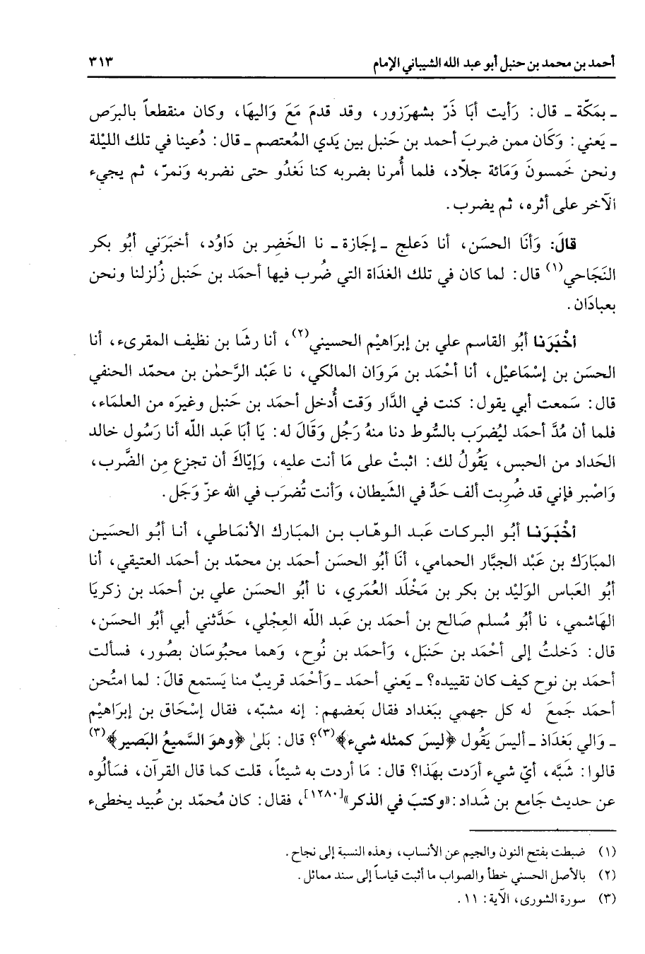 بمكة قال رأيت أبا ذر بشهرزور وقد قدم مع واليها وكان منقطعا بالبرص يعني وكان ممن ضرب أحمد بن حنبل بين يدي المعتصم قال دعينا في تلك الليلة ونحن خمسون ومائة جلاد فلما أمرنا بضربه كنا نغدو حتى نضربه ونمر ثم يجئ الآخر على أثره ثم يضرب قال وأنا الحسن أنا دعلج إجازة نا الخضر بن داود أخبرني أبو بكر النجاحي (1) قال لما كان في تلك الغداة التي ضرب فيها أحمد بن حنبل زلزلنا ونحن بعبادان أخبرنا أبو القاسم علي بن إبراهيم الحسيني (2) أنا رشا بن نظيف المقرئ أنا الحسن بن إسماعيل أنا أحمد بن مروان المالكي نا عبد الرحمن بن محمد الحنفي قال سمعت أبي يقول كنت في الدار وقت أدخل أحمد بن حنبل وغيره من العلماء فلما أن مد أحمد ليضرب بالسوط دنا منه رجل وقال له يا أبا عبد الله أنا رسول خالد الحداد من الحبس يقول لك اثبت على ما أنت عليه وإياك أن تجزع من الضرب واصبر فإني قد ضربت ألف حد في الشيطان وأنت تضرب في الله عز وجل أخبرنا أبو البركات عبد الوهاب بن المبارك الأنماطي أنا أبو الحسين المبارك بن عبد الجبار الحمامي أنا أبو الحسن أحمد بن محمد بن أحمد العتيقي أنا أبو العباس الوليد بن بكر بن مخلد العمري نا أبو الحسن علي بن أحمد بن زكريا الهاشمي نا أبو مسلم صالح بن أحمد بن عبد الهل العجلي حدثني أبي أبو الحسن قال دخلت إلى أحمد بن حنبل وأحمد بن نوح وهما محبوسان بصور فسألت أحمد بن نوح كيف كان تقييده يعني أحمد وأحمد قريب منا يستمع قال لما امتحن أحمد جمع له علي جهمي ببغداد فقال بعضهم إنه مشبه فقال إسحاق بن إبراهيم والي بغداذ أليس يقول " ليس كمثله شئ " (3) قال بلى " وهو السميع البصير " (3) قالوا شبه أي شئ أردت بهذا قال ما أردت به شيئا قلت كما قال القرآن فسألوه عن حديث جامع بن شداد وكتب في الذكر فقال كان محمد بن عبيد يخطئ