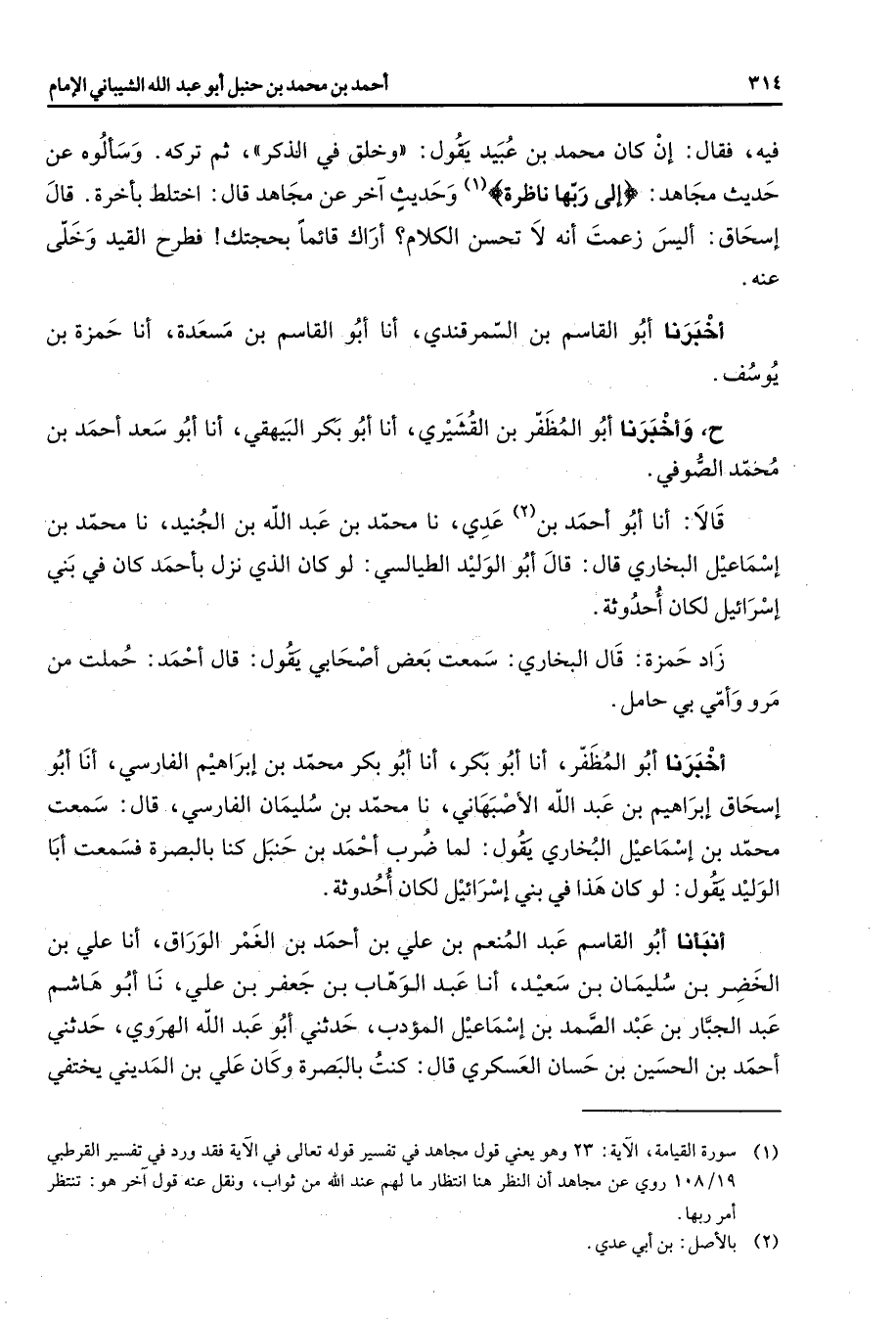 فيه فقال إن كان محمد بن عبيد يقول وخلق في الذكر ثم تركه وسألوه عن حديث مجاهد " إلى ربها ناظرة " (1) وحديث آخر عن مجاهد قال اختلط بأخرة قال إسحاق أليس زعمت أنه لا تحسن الكلام أراك قائما بحجتك فطرح القيد وخلى عنه أخبرنا أبو القاسم بن السمرقندي أنا أبو القاسم بن مسعدة أنا حمزة بن يوسف ح وأخبرنا أبو المظفر بن القشيري أنا أبو بكر البيهقي أنا أبو سعد أحمد بن محمد الصوفي قالا أنا أبو أحمد بن (2) عدي نا محمد بن عبد الله بن الجنيد نا محمد بن إسماعيل البخاري قال قال أبو الوليد الطيالسي لو كان الذي نزل بأحمد كان في بني إسرائيل لكان أحدوثة زاد حمزة قال البخاري سمعت بعض أصحابي يقول قال أحمد حملت من مرو وأمي بي حامل أخبرنا أبو المظفر أنا أبو بكر أنا أبو بكر محمد بن إبراهيم الفارسي أنا أبو إسحاق إبراهيم بن عبد الله الأصبهاني نا محمد بن سلميان الفارسي قال سمعت محمد بن إسماعيل البخاري يقول لما ضرب أحمد بن حنبل كنا بالبصرة فسمعت أبا الوليد يقول لو كان هذا في بني إسرائيل لكان أحدوثة أنبأنا أبو القاسم عبد المنعم بن علي بن أحمد بن الغمر الوراق أنا علي بن الخضر بن سليمان بن سعيد أنا عبد الوهاب بن جعفر بن علي نا أبو هاشم عبد الجبار بن عبد الصمد بن إسماعيل المؤدب حدثني أبو عبد الله الهروي حدثني أحمد بن الحسين بن حسان العسكري قال كنت بالبصرة وكان علي بن المديني يختفي