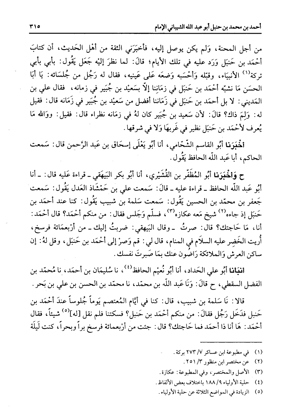 من أجل المحنة ولم يكن يوصل إليه فأخبرني الثقة من أهل الحديث أن كتاب أحمد بن حنبل ورد عليه في تلك الأيام قال لما نظر إليه جعل يقول بأبي بأبي تركة (1) الأنبياء وقبله وأحسبه وضعه على عينيه فقال له رجل من جلسائه يا أبا الحسن ما نشبه أحمد بن حنبل في زماننا إلا بسعيد بن جبير في زمانه فقال علي بن المديني لا بل أحمد بن حنبل في زماننا أفضل من سعيد بن جبير في زمانه قال فقيل له ولم ذاك قال لأن سعيد بن جبير كان له في زمانه نظراء قال فقيل ووالله ما يعرف لأحمد بن حنبل نظير في غربها ولا في شرقها أخبرنا أبو القاسم الشحامي أنا أبو يعلى إسحاق بن عبد الرحمن قال سمعت الحاكم أبا عبد الله الحافظ يقول ح وأخبرنا أبو المظفر بن القشيري أنا أبو بكر البيهقي قراءة عليه قال أنا أبو عبد الله الحافظ قراءة عليه قال سمعت علي بن حمشاذ العدل يقول سمعت جعفر بن محمد بن الحسين يقول سمعت سلمه بن شبيب يقول كنا عند أحمد بن حنبل إذ جاءه (2) شيخ معه عكازه (3) فسلم وجلس فقال من منكم أحمد قال أحمد أنا ما حاجتك قال صرت وقال البيهقي ضربت إليك من أربعمائة فرسخ أريت الخضر عليه السلام في المنام قال لي قم وصر إلى أحمد بن حنبل وقل له إن ساكن العرش والملائكة راضون عنك بما صبرت نفسك أنبأنا أبو علي الحداد أنا أبو نعيم الحافظ (4) نا سليمان بن أحمد نا محمد بن الفضل السقطي قال ونا عبد الله بن محمد نا محمد بن الحسن بن علي بن بحر قالا نا سلمة بن شبيب قال كنا في أيام المعتصم يوما جلوسا عند أحمد بن حنبل فدخل رجل فقال من منكم أحمد بن حنبل فسكتنا فلم نقل له (5) شيئا فقال أحمد ها أنا ذا أحمد فما حاجتك قال جئت من أربعمائة فرسخ برا وبحرا كنت ليلة