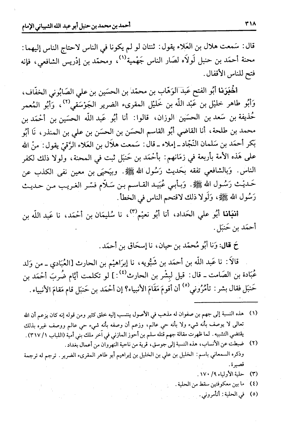 قال سمعت هلال بن العلاء يقول ثنتان لو لم يكونا في الناس لا حتاج النا س إليهما محنة أحمد بن حنبل لولاه لصار الناس جهمية (1) ومحمد بن إدريس الشافعي فإنه فتح للناس الأقفال أخبرنا أبو الفتح عبد الوهاب بن محمد بن الحسين بن علي الصابوني الخفاف وأبو طاهر خليل بن عبد الله بن خليل المقرئ الضرير الجوسقي (2) وأبو المعمر حذيفة بن سعد بن الحسين الوزان قالوا أنا أبو عبد الله الحسين بن أحمد بن محمد بن طلحة أنا القاضي أبو القاسم الحسن بن الحسن بن علي بن المنذر نا أبو بكر أحمد بن سلمان النجاد إملاء قال سمعت هلال بن العلاء الرقي يقول من الله على هذه الأمة بأربعة في زمانهم بأحمد بن حنبل ثبت في المحنة ولولا ذلك لكفر الناس وبالشافعي تفقه بحديث رسول الله (صلى الله عليه وسلم) وبيحيى بن معين نفى الكذب عن حديث رسول الله (صلى الله عليه وسلم) وبأبي عبيد القاسم بن سلام فسر الغريب من حديث رسول الله (صلى الله عليه وسلم) ولولا ذلك لاقتحم الناس في الخطأ أنبأنا أبو علي الحداد أنا أبو نعيم (3) نا سليمان بن أحمد نا عبد الله بن أحمد بن حنبل ح قال ونا أبو محمد بن حيان نا إسحاق بن أحمد قالا نا عبد الله بن أحمد بن شبويه نا إبراهيم بن الحارث العبادي من ولد عبادة بن الصامت قال قيل لبشر بن الحارث (4) لو تكلمت أيام ضرب أحمد بن حنبل فقال بشر تأمروني (5) أن أقوم مقام الأنبياء إن أحمد بن حنبل قام مقام الأنبياء