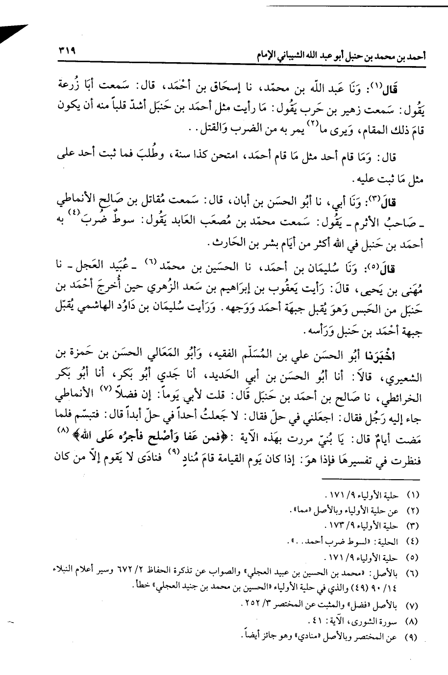 قال (1) ونا عبد الله بن محمد نا إسحاق بن أحمد قال سمعت أبا زرعة يقول سمعت زهير بن حرب يقول ما رأيت مثل أحمد بن حنبل أشد قلبا منه أن يكون قام ذلك المقام ويرى ما يمر به من الضرب والقتل قال وما قام أحد مثل ما قام أحمد امتحن كذا سنة وطلب فما ثبت أحد على مثل ما ثبت عليه قال (3) ونا أبي نا أبو الحسن بن أبان قال سمعت مقاتل بن صالح الأنماطي صاحب الأثرم يقول سمعت محمد بن مصعب العابد يقول سوط ضرب (4) به أحمد بن حنبل في الله أكثر من أيام بشر بن الحارث قال (5) ونا سليمان بن أحمد نا الحسين بن محمد (6) عبيد العجل نا مهنى بن يحيى قال رأيت يعقوب بن إبراهيم بن سعد الزهري حين أخرج أحمد بن حنبل من الحبس وهو يقبل جبهة أحمد ووجهه ورأيت سليمان بن داود الهاشمي يقبل جبهة أحمد بن حنبل ورأسه أخبرنا أبو الحسن علي بن المسلم الفقيه وأبو المعالي الحسن بن حمزة بن الشعيري قالا أنا أبو الحسن بن أبي الحديد أنا جدي أبو بكر أنا أبو بكر الخرائطي نا صالح بن أحمد بن حنبل قال قلت لأبي يوما إن فضلا (7) الأنماطي جاء إليه رجل فقال اجعلني في حل فقال لا جعلت أحدا في حل أبدا قال فتبسم فلما مضت أيام قال يا بني مررت بهذه الآية " فمن عفا وأصلح فأجره على الله " (8) فنظرت في تفسيرها فإذا هو إذا كان يوم القيامة قام مناد (9) فنادى لا يقوم إلا من كان