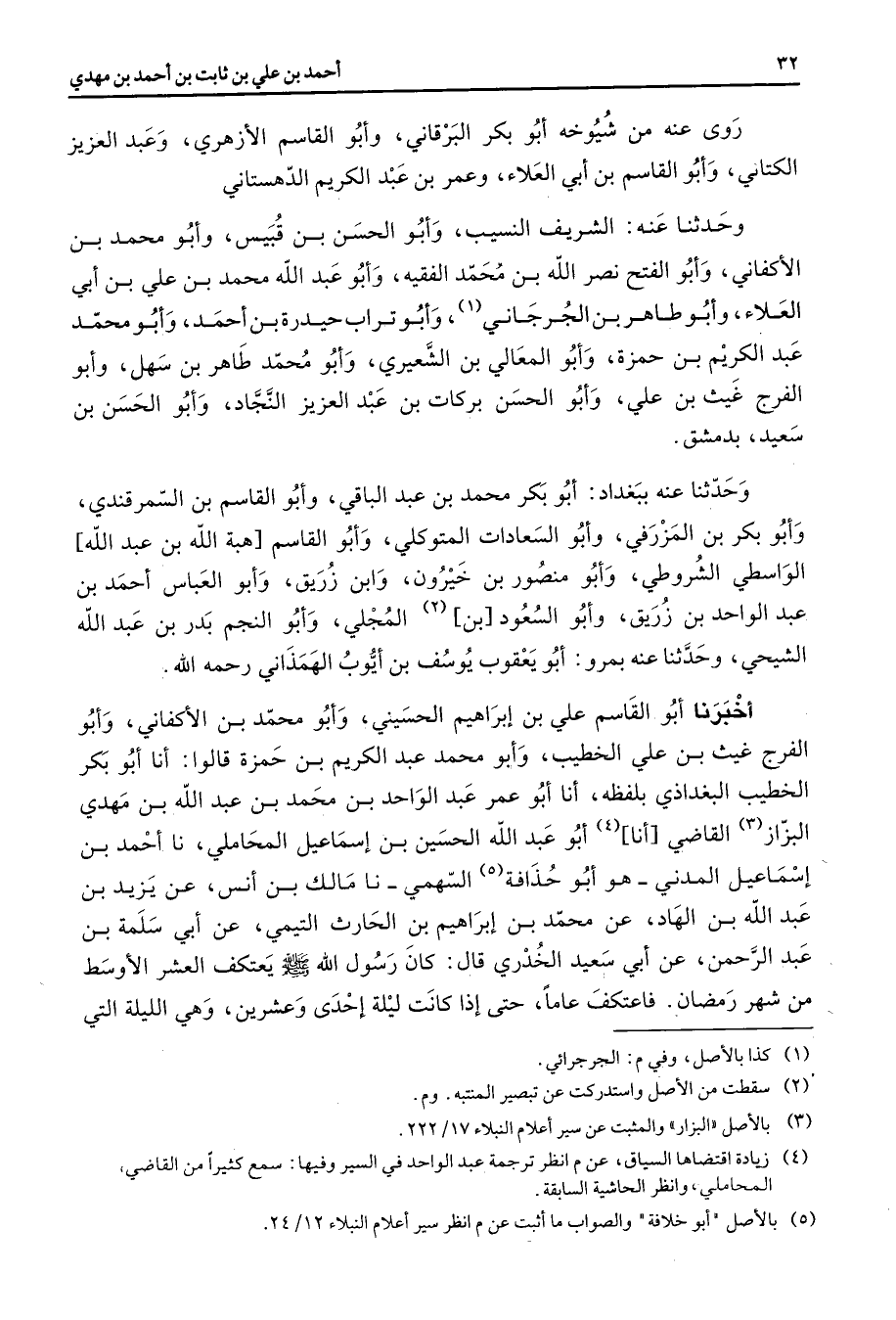 روى عنه من شيوخه أبو بكر البرقاني وأبو القاسم الأزهري وعبد العزيز الكتاني وأبو القاسم بن أبي العلاء وعمر بن عبد الكريم الدهستاني وحدثنا عنه الشريف النسيب وأبو الحسن بن قبيس وأبو محمد بن الأكفاني وأبو الفتح نصر الله بن محمد الفقيه وأبو عبد الله محمد بن علي بن أبي العلاء وأبو طاهر بن الجرجاني (1) وأبو تراب حيدرة بن أحمد وأبو محمد عبد الكريم بن حمزة وأبو المعالي بن الشعيري وأبو محمد طاهر بن سهل وأبو الفرج غيث بن علي وأبو الحسن بركات بن عبد العزيز النجاد وأبو الحسن بن سعيد بدمشق وحدثنا عنه ببغداد أبو بكر محمد بن عبد الباقي وأبو القاسم بن السمرقندي وأبو بكر بن المزرفي وأبو السعادات المتوكلي وأبو القاسم هبة الله بن عبد الله الواسطي الشروطي وأبو منصور بن خيرون وابن زريق وأبو العباس أحمد بن عبد الواحد بن زريق وأبو السعود [بن] (2) المجلي وأبو النجم بدر بن عبد الله الشيحي وحدثنا عنه بمرو أبو يعقوب يوسف بن أيوب الهمذاني رحمه الله أخبرنا أبو القاسم علي بن إبراهيم الحسيني وأبو محمد بن الأكفاني وأبو الفرج غيث بن علي الخطيب وابو محمد عبد الكريم بن حمزة قالوا أنا أبو بكر الخطيب البغداذي بلفظه أنا أبو عمر عبد الواحد بن محمد بن عبد الله بن مهدي البزاز (3) القاضي [أنا] (4) أبو عبد الله الحسين بن إسماعيل المحاملي نا أحمد بن إسماعيل المدني هو أبو حذافة (5) السهمي نا مالك بن أنس عن يزيد بن عبد الله بن الهاد عن محمد بن إبراهيم بن الحارث التيمي عن أبي سلمة بن عبد الرحمن عن أبي سعيد الخدري قال كان رسول الله (صلى الله عليه وسلم) يعتكف العشر الأوسط من شهر رمضان فاعتكف عاما حتى إذا كانت ليلة إحدى وعشرين وهي الليلة التي