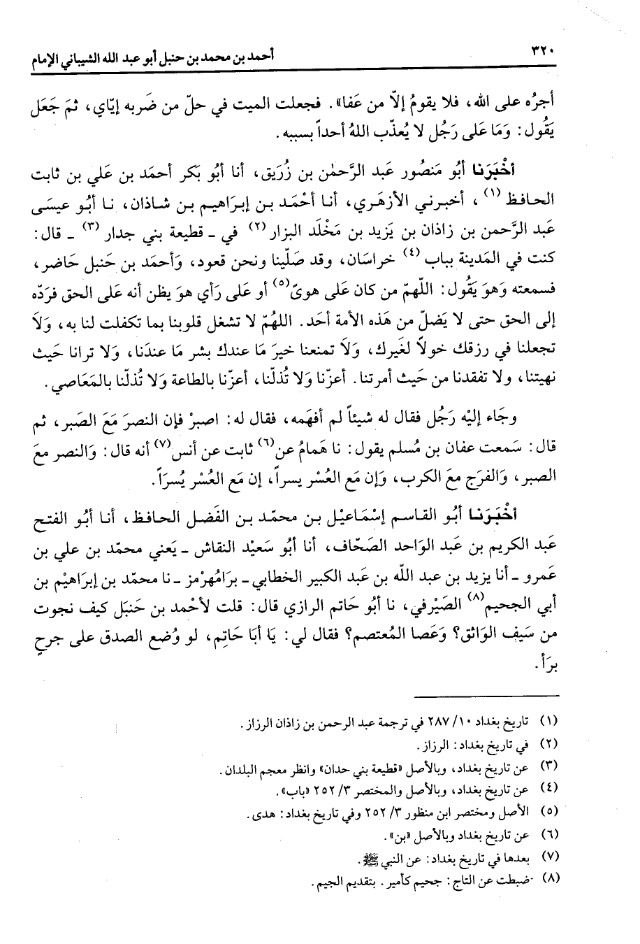 أجره على الله فلا يقوم إلا من عفا فجعلت الميت في حل من ضربه إياي ثم جعل يقول وما على رجل لا يعذب الله أحدا بسببه أخبرنا أبو منصور عبد الرحمن بن زريق أنا أبو بكر أحمد بن علي بن ثابت الحافظ (1) أخبرني الأزهري أنا أحمد بن إبراهيم بن شاذان نا أبو عيسى عبد الرحمن بن زاذان بن يزيد بن مخلد البزار (2) في قطيعة بني جدار (3) قال كنت في المدينة بباب (4) خراسان وقد صلينا ونحن قعود وأحمد بن حنبل حاضر فسمعته وهو يقول اللهم من كان على هوى أو على رأي هو يظن أنه على الحق فرده إلى الحق حتى لا يضل من هذه الأمة أحد اللهم لا تشغل قلوبنا بما تكفلت لنا به ولا تجعلنا في رزقك خولا لغيرك ولا تمنعنا خير ما عندك بشر ما عندنا ولا ترانا حيث نهيتنا ولا تفقدنا من حيث أمرتنا أعزنا ولا تذلنا أعزنا بالطاعة ولا تذلنا بالمعاصي وجاء إليه رجل فقال له شيئا لم أفهمه فقال له اصبر فإن النصر مع الصبر ثم قال سمعت عفان بن مسلم يقول نا همام عن (6) ثابت عن أنس (7) أنه قال والنصر مع الصبر والفرج مع الكرب وإن مع العسر يسرا إن مع العسر يسرا أخبرنا أبو القاسم إسماعيل بن محمد بن الفضل الحافظ أنا أبو الفتح عبد الكريم بن عبد الواحد الصحاف أنا أبو سعيد النقاش يعني محمد بن علي بن عمرو أنا يزيد بن عبد الله بن عبد الكبير الخطابي برامهرمز نا محمد بن إبراهيم بن أبي الجحيم (8) الصيرفي نا أبو حاتم الرازي قال قلت لأحمد بن حنبل كيف نجوت من سيف الواثق وعصا المعتصم فقال لي يا أبا حاتم لو وضع الصدق على جرح برأ