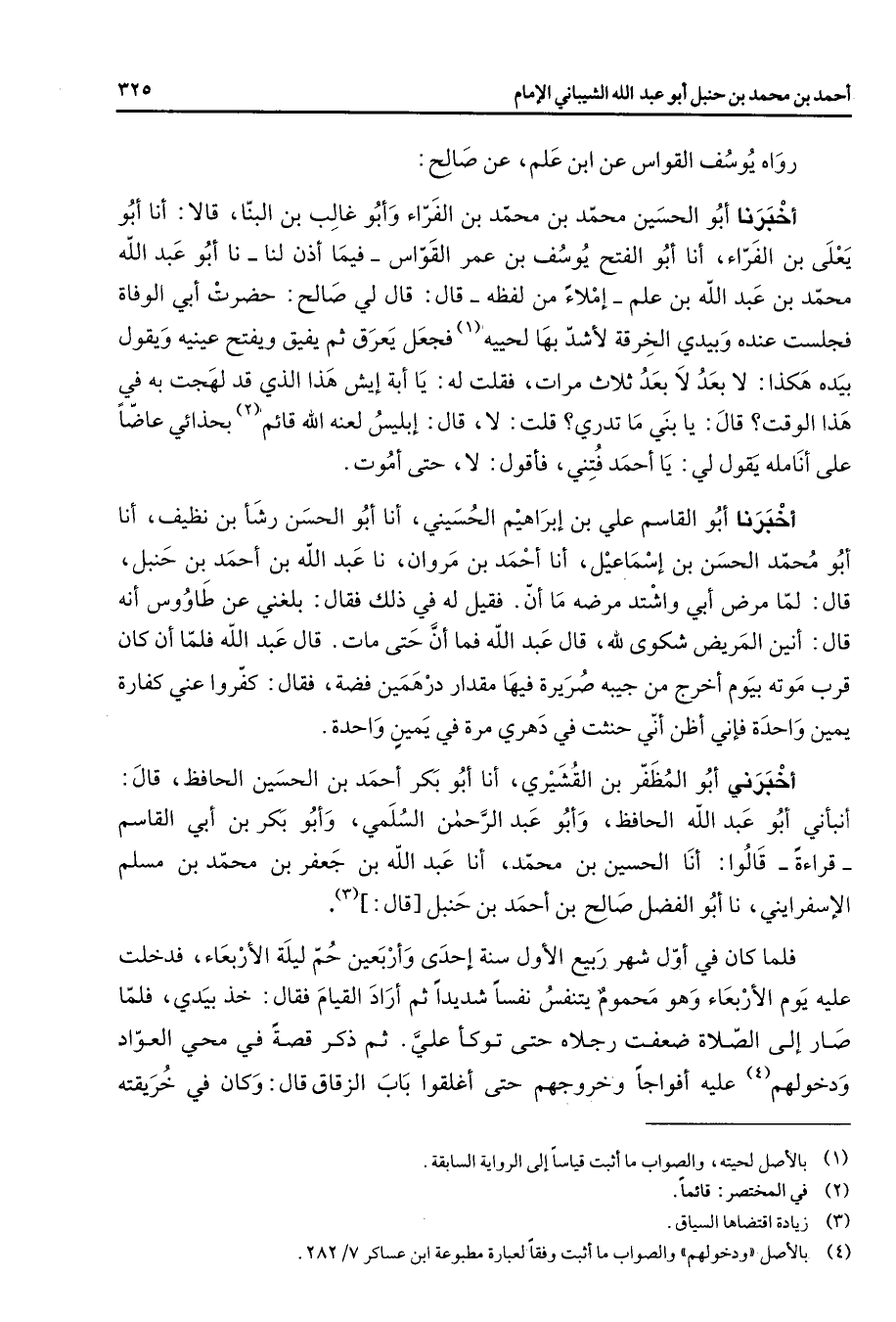 رواه يوسف القواس عن ابن علم عن صالح أخبرنا أبو الحسين محمد بن محمد بن الفراء وأبو غالب بن البنا قالا أنا أبو يعلى بن الفراء أنا أبو الفتح يوسف بن عمر القواس فيما أذن لنا نا أبو عبد الله محمد بن عبد الله بن علم إملاء من لفظه قال قال لي صالح حضرت أبي الوفاة فجلست عنده وبيدي الخرقة لأشد بها لحييه (1) فجعل يعرق ثم يفيق ويفتح عينيه ويقول بيده هكذا لا بعد لا بعد ثلاث مرات فقلت له يا أبة إيش هذا الذي قد لهجت به في هذا الوقت قال يا بني ما تدري قلت لا قال إبليس لعنه الله قائم (2) بحذائي عاضا على أنامله يقول لي يا أحمد فتني فأقول لا حتى أموت أخبرنا أبو القاسم علي بن إبراهيم الحسيني أنا أبو الحسن رشأ بن نظيف أنا أبو محمد الحسن بن إسماعيل أنا أحمد بن مروان نا عبد الله بن أحمد بن حنبل قال لما مرض أبي واشتد مرضه ما أن فقيل له في ذلك فقال بلغني عن طاووس أنه قال أنين المريض شكوى لله قال عبد الله فما أن حتى مات قال عبد الله فلما أن كان قرب موته بيوم أخرج من جيبه صريرة فيها مقدار درهمين فضة فقال كفروا عني كفارة يمين واحدة فإني أظن أني حنثت في دهري مرة في يمين واحدة أخبرني أبو المظفر بن القشيري أنا أبو بكر أحمد بن الحسين الحافظ قال أنبأني أبو عبد الله الحافظ وأبو عبد الرحمن السلمي وأبو بكر بن أبي القاسم قراءة قالوا أنا الحسين بن محمد أنا عبد الله بن جعفر بن محمد بن مسلم الإسفرايني نا أبو الفضل صالح بن أحمد بن حنبل قال (3) فلما كان في أول شهر ربيع الأول سنة إحدى وأربعين حم ليلة الأربعاء فدخلت عليه يوم الأربعاء وهو محموم يتنفس نفسا شديدا ثم أراد القيام فقال خذ بيدي فلما صار إلى الصلاة ضعفت رجلاه حتى توكأ علي ثم ذكر قصة في محي العواد ودخولهم (4) عليه أفواجا وخروجهم حتى أغلقوا باب الزقاق قال وكان في خريقته