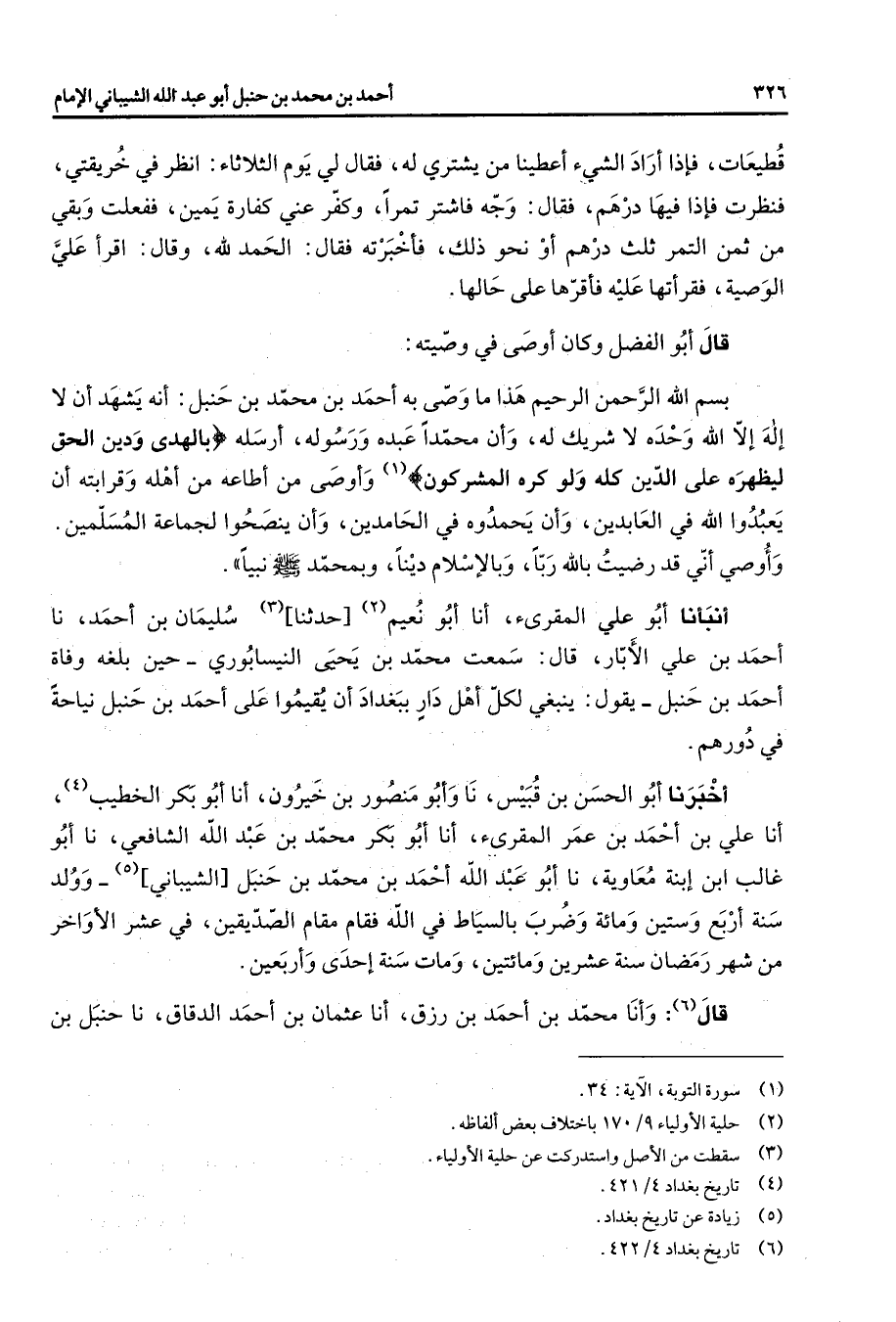 قطيعات فإذا أراد الشئ أعطينا من يشتري له فقال لي يوم الثلاثاء انظر في خريقتي فنظرت فإذا فيها درهم فقال وجه فاشتر تمرا وكفر عني كفارة يمين ففعلت وبقي من ثمن التمر ثلث درهم أو نحو ذلك فأخبرته فقال الحمد لله وقال اقرأ علي الوصية فقرأتها عليه فأقرها على حالها قال أبو الفضل وكان أوصى في وصيته بسم الله الرحمن الرحيم هذا ما وصى به أحمد بن محمد بن حنبل أنه يشهد أن لا إله إلا الله وحده لا شريك له وأن محمدا عبده ورسوله أرسله " بالهدى ودين الحق ليظهره على الدين كله ولو كره المشركون " (1) وأوصى من أطاعه من أهله وقرابته أن يعبدوا الله في العابدين وأن يحمدوه في الحامدين وأن ينصحوا لجماعة المسلمين وأوصي أني قد رضيت بالله ربا وبالإسلام دينا وبمحمد (صلى الله عليه وسلم) نبيا أنبأنا أبو علي المقرئ أنا أبو نعيم (2) حدثنا (3) سليمان بن أحمد نا أحمد بن علي الأبار قال سمعت محمد بن يحيى النيسابوري حين بلغه وفاة أحمد بن حنبل يقول ينبغي لكل أهل دار ببغداد أن يقيموا على أحمد بن حنبل نياحة في دورهم أخبرنا أبو الحسن بن قبيس نا وأبو منصور بن خيرون أنا أبو بكر الخطيب (4) أنا علي بن أحمد بن عمر المقرئ أنا أبو بكر محمد بن عبد الله الشافعي نا أبو غالب ابن إبنة معاوية نا أبو عبد الله أحمد بن محمد بن حنبل الشيباني (5) وولد سنة أربع وستين ومائة وضرب السياط في الله فقام مقام الصديقين في عشر الأواخر من شهر رمضان سنة عشرين ومائتين ومات سنة إحدى وأربعين قال (6) وأنا محمد بن أحمد بن رزق أنا عثمان بن أحمد الدقاق نا حنبل بن