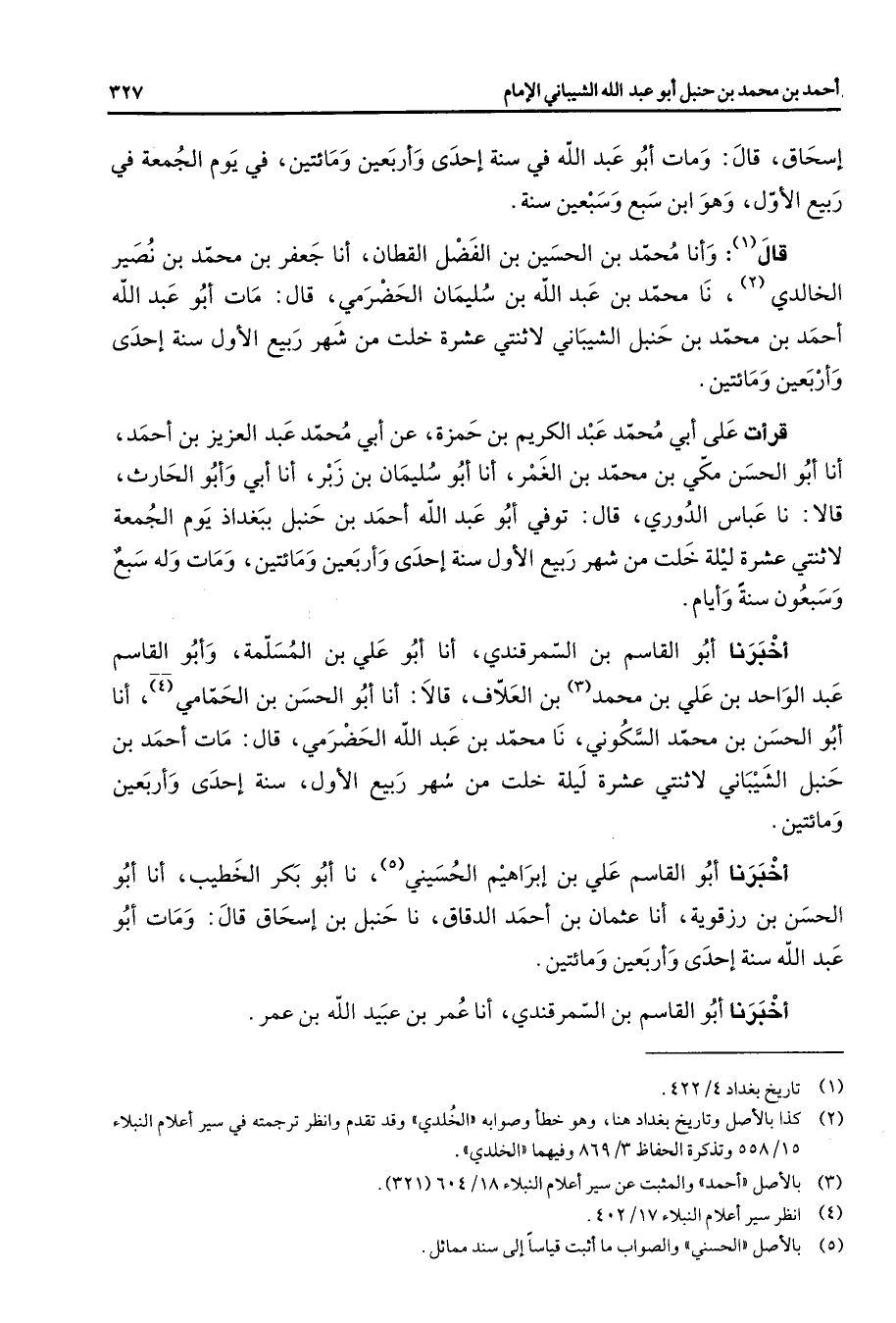 إسحاق قال ومات أبو عبد الله في سنة إحدى وأربعين ومائتين في يوم الجمعة في ربيع الأول وهو ابن سبع وسبعين سنة قال (1) وأنا محمد بن الحسين بن الفضل القطان أنا جعفر بن محمد بن نصير الخالدي (2) نا محمد بن عبد الله بن سليمان الحضرمي قال مات أبو عبد الله أحمد بن محمد بن حنبل الشيباني لأثنتي عشرة خلت من شهر ربيع الأول سنة إحدى وأربعين ومائتين قرأت على أبي محمد عبد الكريم بن حمزة عن أبي محمد عبد العزيز بن أحمد أنا أبو الحسن مكي بن محمد بن الغمر أنا أبو سليمان بن زبر أنا أبي وأبو الحارث قالا نا عباس الدوري قال توفي أبو عبد الله أحمد بن حنبل ببغداذ يوم الجمعة لاثنتي عشرة ليلة خلت من شهر ربيع الأول سنة إحدى وأربعين ومائتين ومات وله سبع وسبعون سنة وأيام أخبرنا أبو القاسم بن السمرقندي أنا أبو علي بن المسلمة وأبو القاسم عبد الواحد بن علي بن محمد (3) بن العلاف قالا أنا أبو الحسن بن الحمامي (4) أنا أبو الحسن بن محمد السكوني نا محمد بن عبد الله الحضرمي قال مات أحمد بن حنبل الشيباني لأثنتي عشرة ليلة خلت من شهر ربيع الأول سنة إحدى وأربعين ومائتين أخبرنا أبو القاسم علي بن إبراهيم الحسيني (5) نا أبو بكر الخطيب أنا أبو الحسن بن رزقوية أنا عثمان بن أحمد الدقاق نا حنبل بن إسحاق قال ومات أبو عبد الله سنة إحدى وأربعين ومائتين أخبرنا أبو القاسم بن السمرقندي أنا عمر بن عبيد الله بن عمر