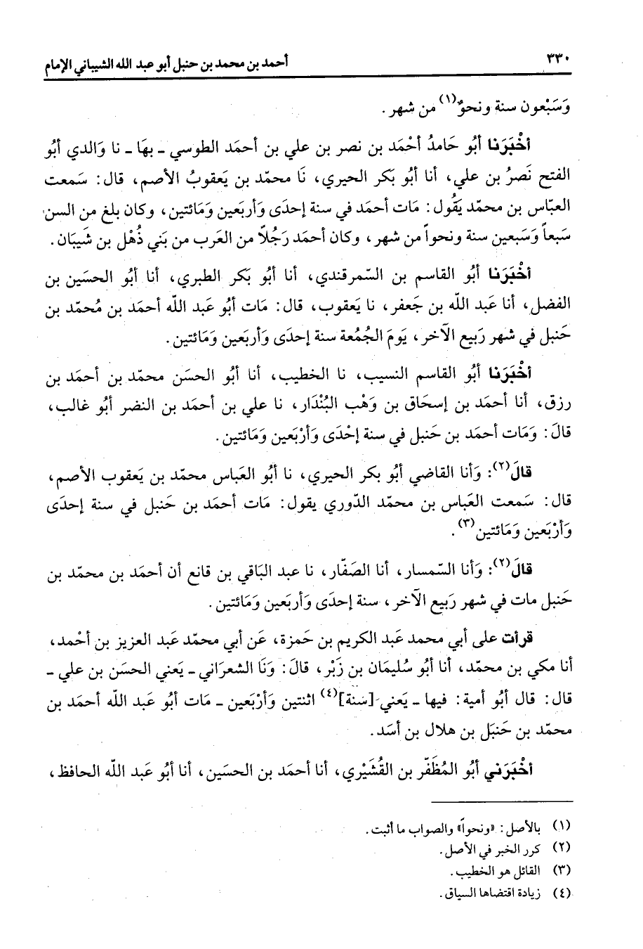 وسبعون سنة ونحو (1) من شهر أخبرنا أبو حامد أحمد بن نصر بن علي بن أحمد الطوسي بها نا والدي أبو الفتح نصر بن علي أنا أبو بكر الحيري نا محمد بن يعقوب الأصم قال سمعت العباس بن محمد يقول مات أحمد في سنة إحدى وأربعين ومائتين وكان بلغ من السن سبعا وسبعين سنة ونحوا من شهر وكان أحمد رجلا من العرب من بني ذهل بن شيبان أخبرنا أبو القاسم بن السمرقندي أنا أبو بكر الطبري أنا أبو الحسين بن الفضل أنا عبد الله بن جعفر نا يعقوب قال مات أبو عبد الله أحمد بن محمد بن حنبل في شهر ربيع الآخر يوم الجمعة سنة إحدى وأربعين ومائتين أخبرنا أبو القاسم النسيب نا الخطيب أنا أبو الحسن محمد بن أحمد بن رزق أنا أحمد بن إسحاق بن وهب البندار نا علي بن أحمد بن النضر أبو غالب قال ومات أحمد بن حنبل في سنة إحدى وأربعين ومائتين قال (2) وأنا القاضي أبو بكر الحيري نا أبو العباس محمد بن يعقوب الأصم قال سمعت العباس بن محمد الدوري يقول مات أحمد بن حنبل في سنة إحدى وأربعين ومائتين (3) قال (2) وأنا السمسار أنا الصفار نا عبد الباقي بن قانع أن أحمد بن محمد بن حنبل مات في شهر ربيع الآخر سنة إحدى وأربعين ومائتين قرأت على أبي محمد عبد الكريم بن حمزة عن أبي محمد عبد العزيز بن أحمد أنا مكي بن محمد أنا أبو سليمان بن زبر قال ونا الشعراني يعني الحسن بن علي قال قال أبو أمية فيها يعني سنة (4) اثنتين وأربعين مات أبو عبد الله أحمد بن محمد بن حنبل بن هلال بن أسد أخبرني أبو المظفر بن القشيري أنا أحمد بن الحسين أنا أبو عبد الله الحافظ * 0 هامش) * (1) بالاصل: " ونحوا " والصواب ما أثبت