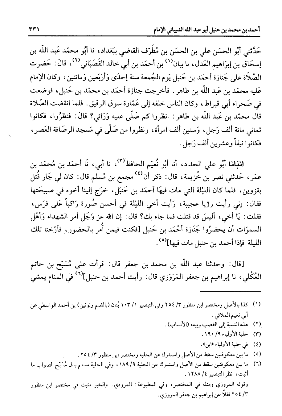 حدثني أبو الحسن علي بن الحسن بن مطرف القاضي ببغداد نا أبو محمد عبد الله بن إسحاق بن إبراهيم العدل نا بيان (1) بن أحمد بن أبي خالد القصباني (2) قال حضرت الصلاة على جنازة أحمد بن حنبل يوم الجمعة سنة إحدى وأربعين ومائتين وكان الإمام عليه محمد بن عبد الله بن طاهر فأخرجت جنازة أحمد بن محمد بن حنبل فوضعت في صحراء أبي قيراط وكان الناس خلفه إلى عمارة سوق الرقيق فلما انقضت الصلاة قال محمد بن عبد الله بن طاهر انظروا كم صلى عليه ورائي قال فنظروا فكانوا ثماني مائة ألف رجل وستين ألف امرأة ونظروا من صلى في مسجد الرصافة العصر فكانوا نيفا وعشرين ألف رجل أنبأنا أبو علي الحداد أنا أبو نعيم الحافظ (3) نا أبي نا أحمد بن محمد بن عمر حدثني نصر بن خزيمة قال ذكر أن (4) مجمع بن مسلم قال كان لي جار قتل بقزوين فلما كان الليلة التي مات فيها أحمد بن حنبل خرج إلينا أخوه في صبيحتها فقال إني رأيت رؤيا عجيبة رأيت أخي الليلة في أحسن صورة راكبا على فرس فقلت يا أخي أليس قد قتلت فما جاء بك قال إن الله عزوجل أمر الشهداء وأهل السموات أن يحضروا جنازة أحمد بن حنبل فكنت فيمن أمر بالحضور فأرخنا تلك الليلة فإذا أحمد بن حنبل مات فيها (5) قال وحدثنا عبد الله بن محمد بن جعفر قال قرأت على مسبح بن حاتم العكلي نا إبراهيم بن جعفر المروزي قال رأيت أحمد بن حنبل (6) في المنام يمشي