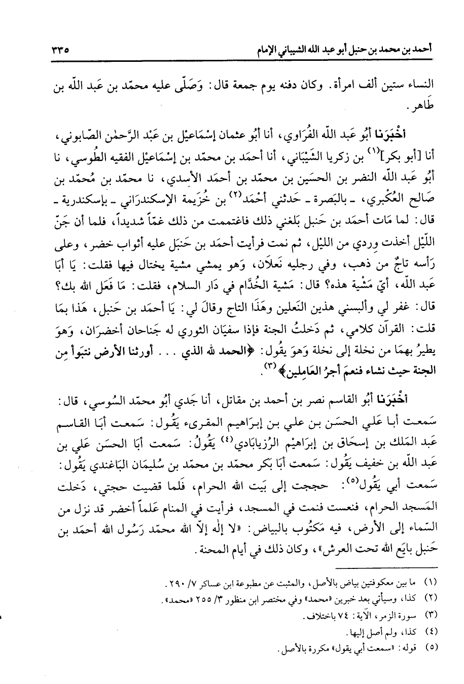 النساء ستين ألف امرأة وكان دفنه يوم جمعة قال وصلى عليه محمد بن عبد الله بن طاهر أخبرنا أبو عبد الله الفراوي أنا أبو عثمان إسماعيل بن عبد الرحمن الصابوني أنا أبو بكر (1) بن زكريا الشيباني أنا أحمد بن محمد بن إسماعيل الفقيه الطوسي نا أبو عبد الله النضر بن الحسين بن محمد أحمد الأسدي نا محمد بن محمد بن صالح العبكري بالبصرة حدثني أحمد (2) بن خزيمة الإسكندراني بإسكندرية قال لما مات أحمد بن حنبل بلغني ذلك فاغتممت من ذلك غما شديدا فلما أن جن الليل أخذت وردي من الليل ثم نمت فرأيت أحمد بن حنبل عليه أثواب خضر وعلى رأسه تاج من ذهب وفي رجليه نعلان وهو يمشي مشية يختال فيها فقلت يا أبا عبد الله أي مشية هذه قال مشية الخدام في دار السلام فقلت ما فعل الله بك قال غفر لي وألبسني هذين النعلين وهذا التاج وقال لي يا أحمد بن حنبل هذا بما قلت القرآن كلامي ثم دخلت الجنة فإذا سفيان الثوري له جناحان أخضران وهو يطير بهما من نخلة إلى نخلة وهو يقول " الحمد لله أورثنا الأرض نتبوأ من الجنة حيث نشاء فنعم أجر العاملين " (3) أخبرنا أبو القاسم نصر بن أحمد بن مقاتل أنا جدي أبو محمد السوسي قال سمعت أبا علي الحسن بنعلي بن إبراهيم المقرئ يقول سمعت أبا القاسم عبد الملك بن إسحاق بن إبراهيم الرزيابادي (4) يقول سمعت أبا الحسن علي بن عبد الله بن خفيف يقول سمعت أبا بكر محمد بن محمد بن سليمان الباغندي يقول سمعت أبي يقول (5) حججت إلى بيت الله الحرام فلما قضيت حجتي دخلت المسجد الحرام فنعست فنمت في المسجد فرأيت في المنام علما أخضر قد نزل من السماء إلى الأرض فيه مكتوب بالبياض لا إله إلا الله محمد رسول الله أحمد بن حنبل بايع الله تحت العرش وكان ذلك في أيام المحنة