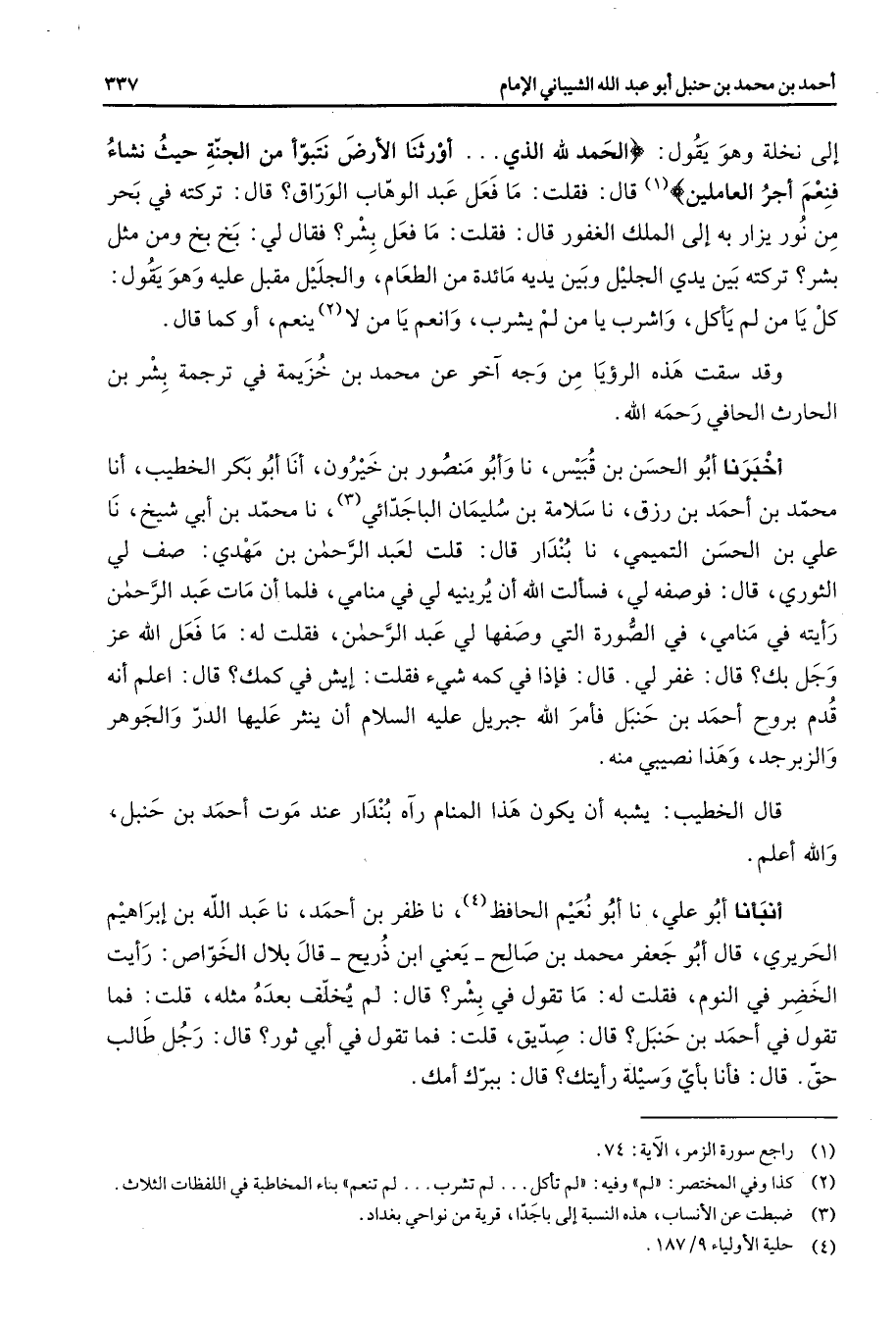 إلى نخلة وهو يقول " الحمد لله الذي أورثنا الأرض نتبوأ من الجنة حيث نشاء فنعم أجر العاملين " (1) قال فقلت ما فعل عبد الوهاب الوراق قال تركته في بحر من نور يزار به إلى الملك الغفور قال فقلت ما فعل بشر فقال لي بخ بخ ومن مثل بشر تركته بين يدي الجليل وبين يديه مائدة من الطعام والجليل مقبل عليه وهو يقول كل يا من لم يأكل واشرب يا من لم يشرب وانعم يا من لا (2) ينعم أو كما قال وقد سقت هذه الرؤيا من وجه آخر عن محمد بن خزيمة في ترجمة بشر بن الحارث الحافي رحمه الله أخبرنا أبو الحسن بن قبيس نا وأبو منصور بن خيرون أنا أبو بكر الخطيب أنا محمد بن أحمد بن رزق نا سلامة بن سليمان الباجدائي (3) نا محمد بن أبي شيخ نا علي بن الحسن التميمي نا بندار قال قلت لعبد الرحمن بن مهدي صف لي الثوري قال فوصفه لي فسألت الله أن يرينيه لي في منامي فلما أن مات عبد الرحمن رأيته في منامي في الصورة التي وصفها لي عبد الرحمن فقلت له ما فعل الله عز وجل بك قال غفر لي قال فإذا في كمه شئ فقلت إيش في كمك قال اعلم أنه قدم بروح أحمد بن حنبل فأمر الله جبريل عليه السلام أن ينثر عليها الدر والجوهر والزبرجد وهذا نصيبي منه قال الخطيب يشبه أن يكون هذا المنام رآه بندار عند موت أحمد بن حنبل والله أعلم أنبأنا أبو علي نا أبو نعيم الحافظ (4) نا ظفر بن أحمد نا عبد الله بن إبراهيم الحريري قال أبو جعفر محمد بن صالح يعني ابن ذريح قال بلال الخواص رأيت الخضر في النوم فقلت له ما تقول في بشر قال لم يخلف بعده مثله قلت فما تقول في أحمد بن حنبل قال صديق قلت فما تقول في أبي ثور قال رجل طالب حق قال فأنا بأي وسيلة رأيتك قال ببرك أمك