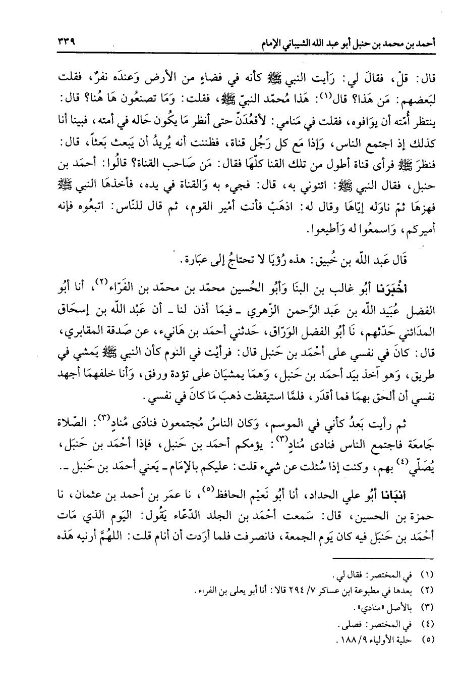 قال قل فقال لي رأيت النبي (صلى الله عليه وسلم) كأنه في فضاء من الأرض وعنده نفر فقلت لبعضهم من هذا قال (1) هذا محمد النبي (صلى الله عليه وسلم) فقلت وما تصنعون ها هنا قال ينتظر أمته أن يوافوه فقلت في منامي لأقعدن حتى أنظر ما يكون حاله في أمته فبينا أنا كذلك إذ اجتمع الناس وإذا مع كل رجل قناة فظننت أنه يريد أن يبعث بعثا قال فنظر (صلى الله عليه وسلم) فرأى قناة أطول من تلك القنا كلها فقال من صاحب القناة قالوا أحمد بن حنبل فقال النبي (صلى الله عليه وسلم) أئتوني به قال فجئ به والقناة في يده فأخذها النبي (صلى الله عليه وسلم) فهزها ثم ناوله إياها وقال له اذهب فأنت أمير القوم ثم قال للناس اتبعوه فإنه أميركم واسمعوا له وأطيعوا قال عبد الله بن خبيق هذه رؤيا لا تحتاج إلى عبارة أخبرنا أبو غالب بن البنا وأبو الحسين محمد بن محمد بن الفراء (2) أنا أبو الفضل عبيد الله بن عبد الرحمن الزهري فيما أذن لنا أن عبد الله بن إسحاق المدائني حدثهم نا أبو الفضل الوراق حدثني أحمد بن هانئ عن صدقة المقابري قال كان في نفسي على أحمد بن حنبل قال فرأيت في النوم كأن النبي (صلى الله عليه وسلم) يمشي في طريق وهو آخذ بيد أحمد بن حنبل وهما يمشيان على تؤدة ورفق وأنا خلفهما أجهد نفسي أن ألحق بهما فما أقدر فلما استيقظت ذهب ما كان في نفسي ثم رأيت بعد كأني في الموسم وكان الناس مجتمعون فنادى مناد (3) الصلاة جامعة فاجتمع الناس فنادى مناد (3) يؤمكم أحمد بن حنبل فإذا أحمد بن حنبل يصلي (4) بهم وكنت إذا سئلت عن شئ قلت عليكم بالإمام يعني أحمد بن حنبل أنبأنا أبو علي الحداد أنا أبو نعيم الحافظ (5) نا عمر بن أحمد بن عثمان نا حمزة بن الحسين قال سمعت أحمد بن الجلد الدعاء يقول اليوم الذي مات أحمد بن حنبل فيه كان يوم الجمعة فانصرفت فلما أردت أن أنام قلت اللهم أرنيه هذه