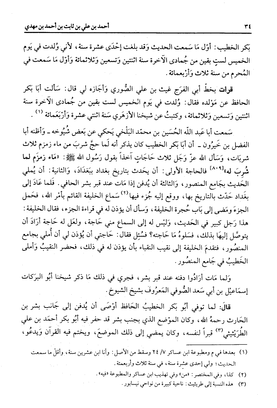 [809] فالحاجة الأولى أن يحدث بتاريخ بغداد ببغداد والثانية أن يملي الحديث بجامع المنصور والثالثة أن يدفن إذا مات عند قبر بشر الحافي فلما عاد إلى بغداد حدث بالتاريخ بها ووقع إليه جزء فيها (2) سماع الخليفة القائم بأمر الله فحمل الجزء ومضى إلى باب حجرة الخليفة وسأل أن يؤذن له في قراءة الجزء فقال الخليفة هذا رجل كبير في الحديث وليس له إلى السماع مني حاجة ولعل له حاجة أراد أن يتوصل إليها بذلك فسلوه ما حاجته فسئل فقال حاجتي أن يؤذن لي أن أملي بجامع المنصور فتقدم الخليفة إلى نقيب النقباء بأن يؤذن له في ذلك فحضر النقيب وأملى الخطيب في جامع المنصور ولما مات أرادوا دفنه عند قبر بشر فجري في ذلك ما ذكر شيخنا أبو البركات إسماعيل بن أبي سعد الصوفي المعروف بشيخ الشيوخ قال لما توفي أبو بكر الخطيب الحافظ أوصى أن يدفن إلى جانب بشر بن الحارث رحمه الله وكان الموضع الذي بجنب بشر قد حفر فيه أبو بكر أحمد بن علي الطريثيثي (3) قبرا لنفسه وكان يمضي إلى ذلك الموضع ويختم فيه القرآن ويدعو