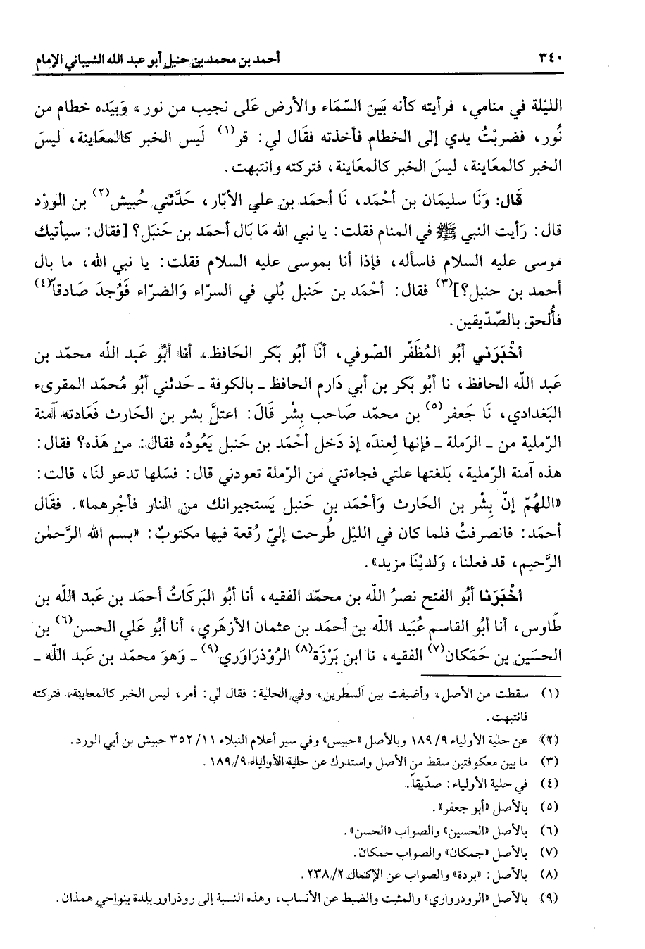 الليلة في منامي فرأيته كأنه بين السماء والأرض على نجيب من نور وبيده خطام من نور فضربت يدي إلى الخطام فأخذته فقال لي قر (1) ليس الخبر كالمعاينة ليس الخبر كالمعاينة ليس الخبر كالمعاينة فتركته وانتبهت قال ونا سليمان بن أحمد نا أحمد بن علي الأبار حدثني حبيش (2) بن الورد قال رأيت النبي (صلى الله عليه وسلم) في المنام فقلت يا نبي الله ما بال أحمد بن حنبل فقال سيأتيك موسى عليه السلام فاسأله فإذا أنا بموسى عليه السلام فقلت يا نبي الله ما بال أحمد بن حنبل (3) فقال أحمد بن حنبل بلي في السراء والضراء فوجد صادقا (4) فألحق بالصديقين أخبرني أبو المظفر الصوفي أنا أبو بكر الحافظ أنا أبو عبد الله محمد بن عبد الله الحافظ نا أبو بكر بن أبي دارم الحافظ بالكوفة حدثني أبو محمد المقرئ البغدادي نا جعفر (5) بن محمد صاحب بشر قال اعتل بشر بن الحارث فعادته آمنة الرملية من الرملة فإنها لعنده إذ دخل أحمد بن حنبل يعوده فقال من هذه فقال هذه آمنة الرملية بلغتها علتي فجاءتني من الرملة تعودني قال فسلها تدعو لنا قالت اللهم إن بشر بن الحارث وأحمد بن حنبل يستجيرانك من النار فأجرهما فقال أحمد فانصرفت فلما كان من الليل طرحت إلي رقعة فيها مكتوب بسم الله الرحمن الرحيم قد فعلنا ولدينا مزيد أخبرنا أبو الفتح نصر الله بن محمد الفقيه أنا أبو البركات أحمد بن عبد الله بن طاوس أنا أبو القاسم عبيد الله بن أحمد بن عثمان الأزهري أنا أبو علي الحسن (6) بن الحسين بن حمكان (7) الفقيه نا ابن برزة (8) الروذراوري (9) وهو محمد بن عبد الله