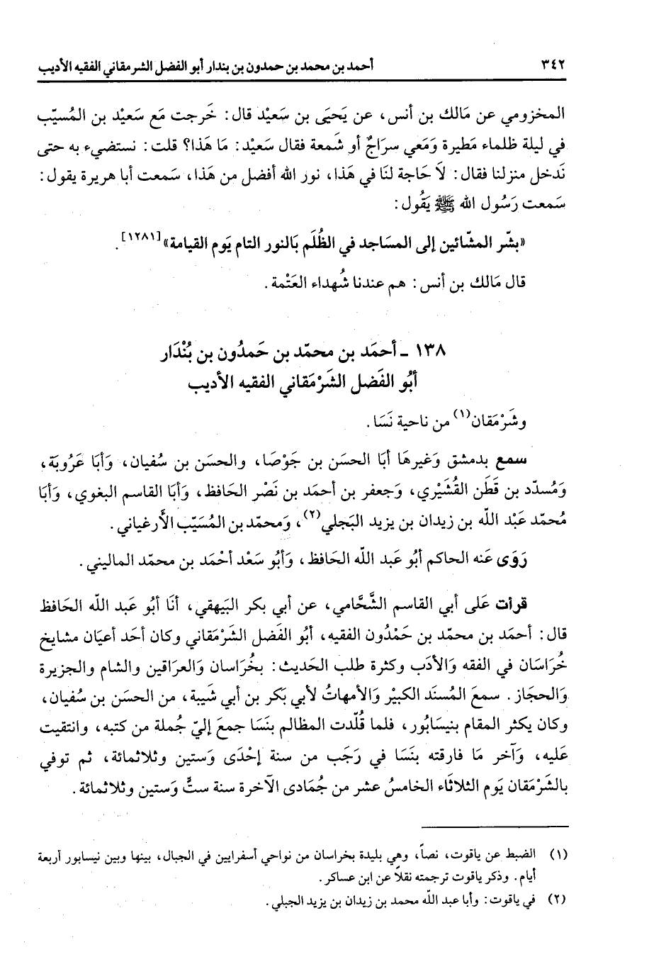 138 - أحمد بن محمد بن حمدون بن بندار أبو الفضل الشرمقاني الفقيه الأديب وشرمقان (1) من ناحية نسا سمع بدمشق وغيرها أبا الحسن بن جوصا والحسن بن سفيان وأبا عروبة ومسدد بن قطن القشيري وجعفر بن أحمد بن نصر الحافظ وأبا القاسم البغوي وأبا محمد عبد الله بن زيدان بن يزيد البجلي (2) ومحمد بن المسيب الأرغياني روى عنه الحاكم أبو عبد الله الحافظ وأبو سعد أحمد بن محمد الماليني قرأت على أبي القاسم الشحامي عن أبي بكر البيهقي أنا أبو عبد الله الحافظ قال أحمد بن محمد بن حمدون الفقيه أبو الفضل الشرمقاني وكان أحد أعيان مشايخ خراسان في الفقه والأدب وكثرة طلب الحديث بخراسان والعراقين والشام والجزيرة والحجاز سمع المسند الكبير والأمهات لأبي بكر بن أبي شيبة من الحسن بن سفيان وكان يكثر المقام بنيسابور فلما قلدت المظالم بنسا جمع إلي جملة من كتبه وانتقيت عليه وآخر ما فارقته بنسا في رجب من سنة إحدى وستين وثلاثمائة ثم توفي بالشرمقان يوم الثلاثاء الخامس عشر من جمادى الآخرة سنة ست وستين وثلاثمائة