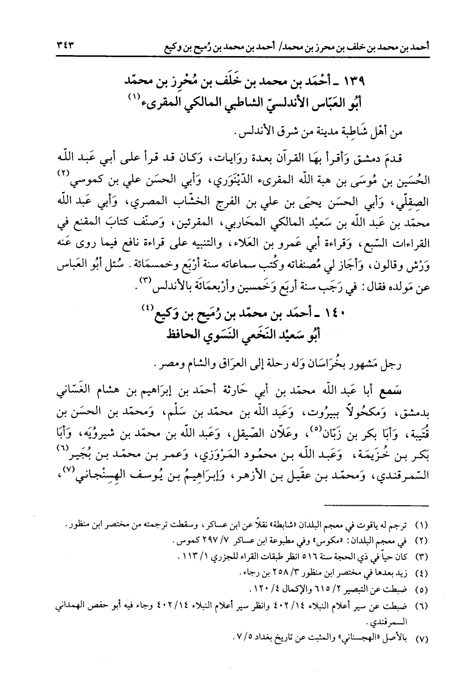 139 - أحمد بن محمد بن خلف بن محرز بن محمد أبو العباس الأندلسي الشاطبي المالكي المقرئ (1) من أهل شاطبة مدينة من شرق الأندلس قدم دمشق وأقرأ بها القرآن بعدة روايات وكان قد قرأ على أبي عبد الله الحسين بن موسى بن هبة الله المقرئ الدينوري وأبي الحسن علي ين كموسي (2) الصقلي وأبي الحسن يحيى بن علي بن الفرج الخشاب المصري وأبي عبد الله محمد بن عبد الله بن سعيد المالكي المحاربي المقرئين وصنف كتاب المقنع في القراءات السبع وقراءة أبي عمرو بن العلاء والتنبيه على قراءة نافع فيما روى عنه ورش وقالون وأجاز لي مصنفاته وكتب سماعاته سنة أربع وخمسمائة سئل أبو العباس عن مولده فقال في رجب سنة أربع وخمسين وأربعمائة بالأندلس (3)