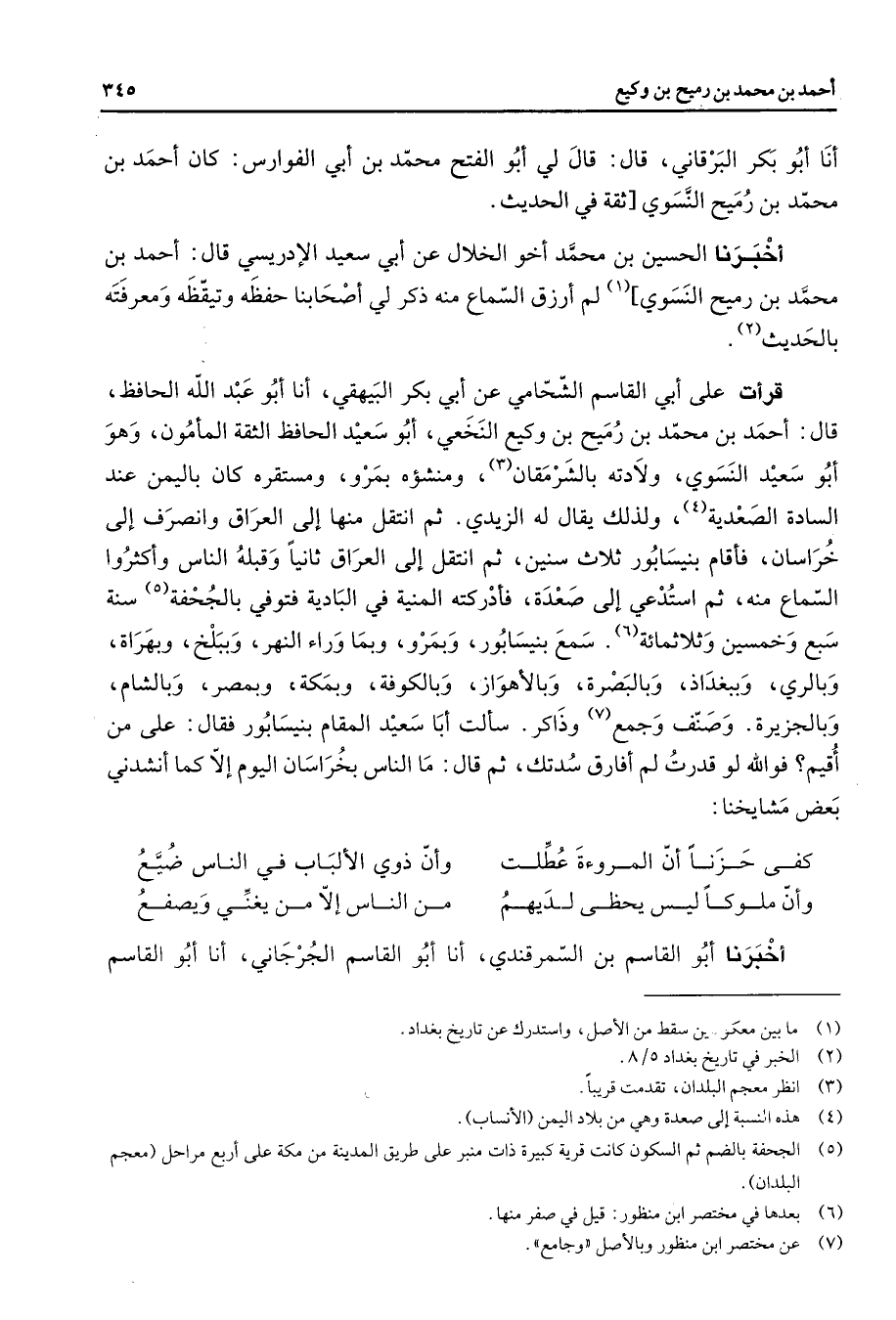 أنا أبو بكر البرقاني قال قال لي أبو الفتح محمد بن أبي الفوارس كان أحمد بن محمد بن رميح النسوي ثقة في الحديث أخبرنا الحسين بن محمد أخو الخلال عن أبي سعيد الإدريسي قال أحمد بن محمد بن رميح النسوي (1) لم أرزق السماع منه ذكر لي أصحابنا حفظه وتيقظه ومعرفته بالحديث (2) قرأت على أبي القاسم الشحامي عن أبي بكر البيهقي أنا أبو عبد الله الحافظ قال أحمد بن محمد بن رميح بن وكيع النخعي أبو سعيد الحافظ الثقة المأمون وهو أبو سعيد النسوي ولادته بالشرمقان (3) ومنشؤه بمرو ومستقره كان باليمن عند السادة الصعدية (4) ولذلك يقال له الزيدي ثم انتقل منها إلى العراق وانصرف إلى خراسان فأقام بنيسابور ثلاث سنين ثم انتقل إلى العراق ثانيا وقبله الناس وأكثروا السماع منه ثم استدعى إلى صعدة فأدركته المنية في البادية فتوفي بالجحفة (5) سنة سبع وخمسين وثلاثمائة (6) سمع بنيسابور وبمرو وبما وراء النهر وببلخ وبهراة وبالري ببغداذ وبالبصرة وبالأهواز وبالكوفة وبمكة وبمصر وبالشام وبالجزيرة وصنف وجمع (7) وذاكر سألت أبا سعيد المقام بنيسابور فقال على من أقيم فوالله لو قدرت لم أفارق سدتك ثم قال ما الناس بخراسان اليوم إلا كما أنشدني بعض مشايخنا * كفى حزنا أن المروءة عطلت * وأن ذوي الألباب في الناس ضيع وأن ملوكا ليس يحظى لديهم * من الناس إلا من يغني ويصفع * أخبرنا أبو القاسم بن السمرقندي أنا أبو القاسم الجرجاني أنا أبو القاسم