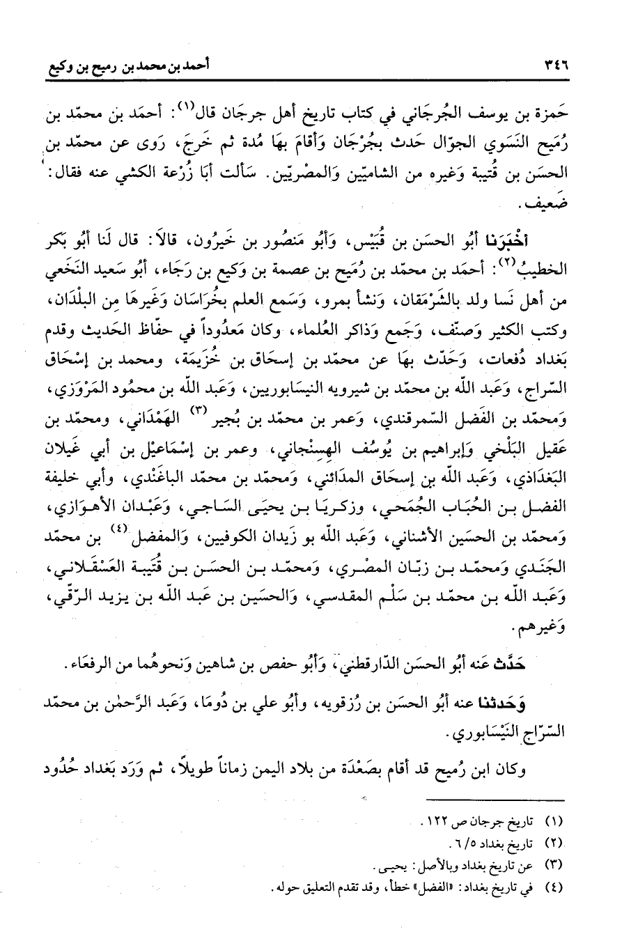 حمزة بن يوسف الجرجاني في كتاب تاريخ أهل جرجان قال (1) أحمد بن محمد بن رميح النسوي الجوال حدث بجرجان وأقام بها مدة ثم خرج روى عن محمد بن الحسن بن قتيبة وغيره من الشاميين والمصريين سألت أبا زرعة الكشي عنه فقال ضعيف أخبرنا أبو الحسن بن قبيس وأبو منصور بن خيرون قالا قال لنا أبو بكر الخطيب (2) أحمد بن محمد بن رميح بن عصمة بن وكيع بن رجاء أبو سعيد النخعي من أهل نسا ولد بالشرمقان ونشأ بمرو وسمع العلم بخراسان وغيرها من البلدان وكتب الكثير وصنف وجمع ذاكر العلماء وكان معدودا في حفاظ الحديث وقدم بغداد دفعات وحدث بها عن محمد بن إسحاق بن خزيمة ومحمد بن إسحاق السراج وعبد الله بن محمد بن شيروية النيسابوريين وعبد الله بن محمود المروزي ومحمد بن الفضل السمرقندي وعمر بن محمد بن بجير (3) الهمداني ومحمد بن عقيل البلخي وإبراهيم بن يوسف الهسنجاني وعمر بن إسماعيل بن أبي غيلان البغداذي وعبد الله بن إسحاق المدائني ومحمد بن محمد الباغندي وأبي خليفة الفضل بن الحباب الجمحي وزكريا بن يحيى الساجي وعبدان الأهوازي ومحمد بن الحسين الأشناني وعبد الله بو زيدان الكوفيين والمفضل (4) بن محمد الجندي ومحمد بن زبان المصري ومحمد بن الحسن بن قتيبة العسقلاني وعبد الله بن محمد بن سلم المقدسي والحسين بن عبد الله بن يزيد الرقي وغيرهم حدث عنه أبو الحسن الدارقطني وأبو حفص بن شاهين ونحوهما من الرفعاء وحدثنا عنه أبو الحسن بن رزقويه وأبو علي بن دوما وعبد الرحمن بن محمد السراج النيسابوري وكان ابن رميح قد أقام بصعدة من بلاد اليمن زمانا طويلا ثم ورد بغداد حدود