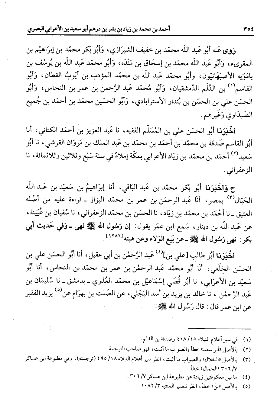 روى عنه أبو عبد الله محمد بن خفيف الشيرازي وابو بكر محمد بن إبراهيم بن المقرئ وأبو عبد الله محمد بن إسحاق بن منده وأبو محمد عبد الله بن يوسف بن بامويه الأصبهانيون وأبو محمد عبد الله بن محمد المؤدب بن أيوب القطان وأبو القاسم (1) بن الدلم الدمشقيان وأبو محمد عبد الرحمن بن عمر بن النحاس وأبو الحسن علي بن الحسن بن بندار الأستر ابادي وأبو الحسين محمد بن أحمد بن جميع الصيداوي وغيرهم اخبرنا أبو الحسن علي بن المسلم الفقيه نا عبد العزيز بن أحمد الكتاني أنا أبو القاسم صدقة بن محمد بن أحمد بن محمد بن عبد الملك بن مروان القرشي نا أبو سعيد (2) احمد بن محمد بن زياد الاعرابي بمكة إملاء في سنة سبع وثلاثين وثلاثمائة نا الزعفراني ح واخبرنا أبو بكر محمد بن عبد الباقي أنا إبراهيم بن سعيد بن عبد الله الحبال (3) بمصر أنا عبد الرحمن بن عمر بن محمد البزاز قراءة عليه من أصله العتيق نا أحمد بن محمد بن زياد نا الحسن بن محمد الزعفراني نا سفيان بن عيينة عن عبد الله بن دينار سمع ابن عمر يقول إن رسول الله (صلى الله عليه وسلم) نهى وفي حديث أبي بكر نهى رسول الله (صلى الله عليه وسلم) عن بيع الولاء وعن هبته أخبرنا أبو طالب علي بن (4) عبد الرحمن بن أبي عقيل أنا أبو الحسن علي بن الحسن الخلعي أنا أبو محمد عبد الرحمن بن عمر بن محمد بن النحاس أنا أبو سعيد بن الأعرابي نا أبو قصي إسماعيل بن محمد العذري بدمشق نا سليمان بن عبد الرحمن نا خالد بن يزيد بن أسد البجلي عن الصلت بن بهرام عن (5) يزيد الفقير عن ابن عمر قال قال رسول الله (صلى الله عليه وسلم)