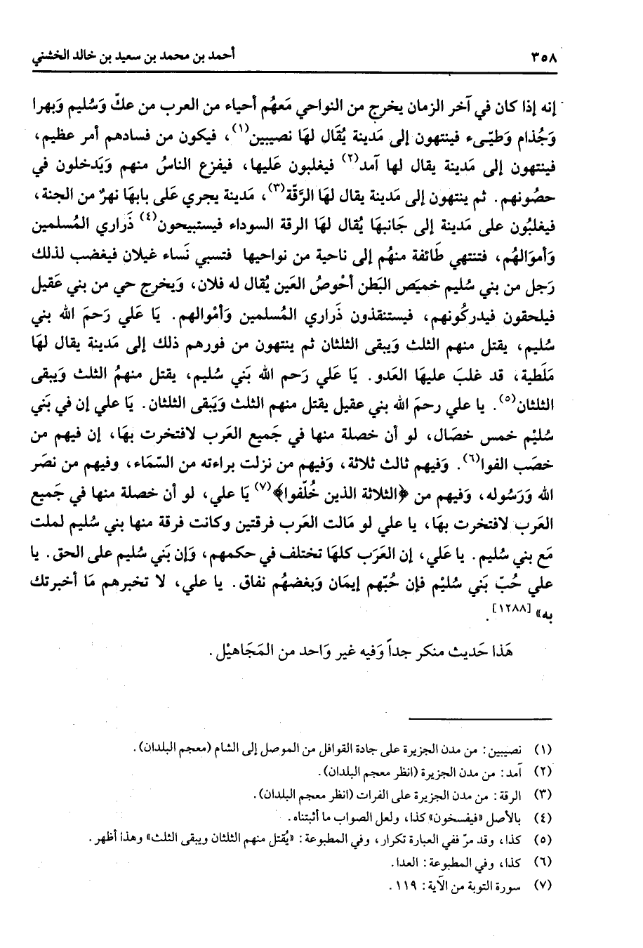 إنه إذا كان في آخر الزمان يخرج من النواحي معهم أحياء من العرب من عك وسليم وبهرا وجذام وطيئ فينتهون إلى مدينة يقال لها نصيبين (1) فيكون من فسادهم أمر عظيم فينتهون إلى مدينة يقال لها آمد (2) فيغلبون عليها فيفزع الناس منهم ويدخلون في حصونهم ثم ينتهون إلى مدينة يقال لها الرقة مدينة يجري على بابها نهر من الجنة فيغلبون على مدينة إلى جانبها يقال لها الرقة السوداء فيستبيحون (4) ذراري المسلمين وأموالهم فتنتهي طائفة منهم إلى ناحية من نواحيها فتسبي نساء غيلان فيغضب لذلك رجل من بني سليم خميص البطن أحوص العين يقال له فلان ويخرج حي من بني عقيل فيلحقون فيدركونهم فيستنقذون ذراري المسلمين وأموالهم يا علي رحم الله بني سليم يقتل منهم الثلث ويبقى الثلثان ثم ينتهون من فورهم ذلك إلى مدينة يقال لها ملطية قد غلب عليها العدو يا علي رحم الله بني سليم يقتل منهم الثلث ويبقى الثلثان (5) يا علي رحم الله بني عقيل يقتل منهم الثلث ويبقى الثلثان يا علي إن في بني سليم خمس خصال لو أن خصلة منها في جميع العرب لافتخرت بها إن فيهم من خصب الفوا (6) وفيهم ثالث ثلاثة وفيهم من نزلت براءته من السماء وفيهم من نصر الله ورسوله وفيهم من " الثلاثة الذين خلفوا " (7) يا علي لو أن خصلة منها في جميع العرب لافتخرت بها يا علي لو مالت العرب فرقتين وكانت فرقة منها بني سليم لملت مع بني سليم يا علي إن العرب كلها تختلف في حكمهم وإن بني سليم على الحق يا علي حب بني سليم فإن حبهم إيمان وبغضهم نفاق يا علي لا تخبرهم ما أخبرتك به هذا حديث منكر جدا وفيه غير واحد من المجاهيل
