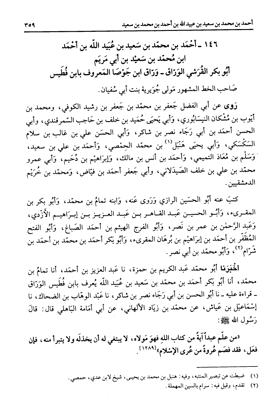 146 - أحمد بن محمد بن سعيد بن عبيد الله بن أحمد ابن محمد بن سعيد بن أبي مريم أبو بكر القرشي الوراق وراق ابن جوصا المعروف بابن فطيس صاحب الخط المشهور مولى جويرية بنت أبي سفيان روى عن أبي الفضل جعفر بن محمد بن جعفر بن رشيد الكوفي ومحمد بن أيوب بن مشكان النيسابوري وأبي يحيى حميد بن خلف بن حاجب السمرقندي وأبي الحسن أحمد بن أبي رجاء نصر بن شاكر وأبي الحسن علي بن غالب بن سلام السكسكي زأبي يحيى هنبل (1) بن محمد الحمصي وأحمد بن علي بن سعيد وسلم بن معاذ التميمي وأحمد بن أنس بن مالك وأبرهيم بن دحيم وأبي عمرو محمد بن علي بن خلف الصيدلاني وأبي جعفر أحمد بن فياض ومحمد بن خريم الدمشقيين كتب عنه أبو الحسن الرازي وروى عنه وابنه تمام بن محمد وأبو بكر بن المقرئ وأبو الحسين عبد القاهر بن عبد العزيز بن إبراهيم الأزدي وعبد الرحمن بن عمر بن نصر وأبو الفرج الهيثم بن أحمد الصباغ وأبو الفتح المظفر بن أحمد بن إبراهيم بن برهان المقرئ وأبو بكر أحمد بن محمد بن أحمد بن شرام (2) وأبو محمد بن أبي النصر أخبرنا أبو محمد عبد الكريم بن حمزة نا عبد العزيز بن أحمد أنا تمام بن محمد أنا أبو بكر أحمد بن محمد بن سعيد بن عبيد الله يعرف بابن فطيس الوراق قراءة عليه نا أبو الحسن بن أبي رجاء نصر بن شاكر نا عبد الوهاب بن الضحاك نا إسماعيل بن عياش عن محمد بن زياد الألهاني عن أبي أمامة الباهلي قال قال رسول الله (صلى الله عليه وسلم) من علم عبدا آية من كتاب الله فهو مولاه لا يبتغي له أن يخذله ولا يتبرأ منه فإن فعل فقد فصم عروة من عرى الإسلام
