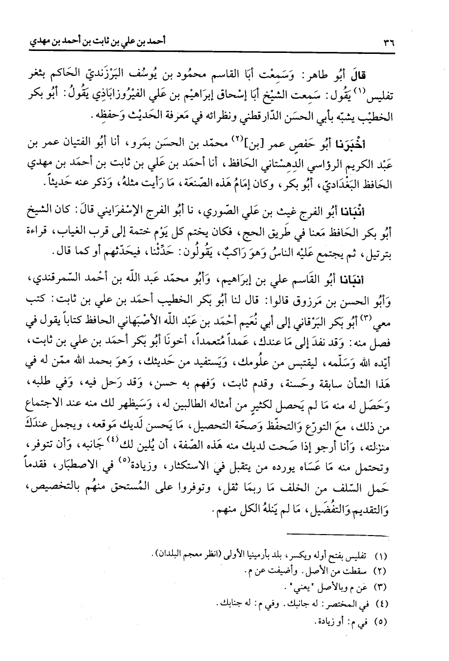 قال أبو طاهر وسمعت أبا القاسم محمود بن يوسف البرزندي الحاكم بثغر تفليس (1) يقول سمعت الشيخ أبا إسحاق إبراهيم بن علي الفيروزآبادي يقول أبو بكر الخطيب يشبه بأبي الحسن الدارقطني ونظرائه في معرفة الحديث وحفظه أخبرنا أبو حفص عمر [بن] (2) محمد بن الحسن بمرو أنا أبو الفتيان عمر بن عبد الكريم الرؤاسي الدهستاني الحافظ أنا أحمد بن علي بن ثابت بن أحمد بن مهدي الحافظ البغدادي أبو بكر وكان إمام هذه الصنعة ما رأيت مثله وذكر عنه حديثا أنبأنا أبو الفرج غيث بن علي الصوري نا أبو الفرج الإسفرايني قال كان الشيخ أبو بكر الحافظ معنا في طريق الحج فكان يختم كل يوم ختمة إلى قرب الغياب قراءة بترتيل ثم يجتمع عليه الناس وهو راكب يقولون حدثنا فيحدثهم أو كما قال أنبأنا أبو القاسم علي بن إبراهيم وأبو محمد عبد الله بن أحمد السمرقندي وأبو الحسن بن مرزوق قالوا قال لنا أبو بكر الخطيب أحمد بن علي بن ثابت كتب معي (3) أبو بكر البرقاني إلى أبي نعيم أحمد بن عبد الله الأصبهاني الحافظ كتابا يقول في فصل منه وقد نفد إلى ما عندك عمدا متعمدا أخونا أبو بكر أحمد بن علي بن ثابت أيده الله وسلمه ليقتبس من علومك ويستفيد من حديثك وهو بحمد الله ممن له في هذا الشأن سابقة وحسنة وقدم ثابت وفهم به حسن وقد رحل فيه وفي طلبه وحصل له منه ما لم يحصل لكثير من أمثاله الطالبين له وسيظهر لك منه عند الاجتماع من ذلك مع التورع والتحفظ وصحة التحصيل ما يحسن لديك موقعه ويجمل عندك منزلته وأنا أرجو إذا صحت لديك منه هذه الصفة أن يلين لك (4) جانبه وأن تتوفر وتحتمل منه ما عساه يورده من يتقبل في الاستكثار وزيادة (5) في الاصطبار فقدما حمل السلف من الخلف ما ربما ثقل وتوفروا على المستحق منهم بالتخصيص والتقديم والتفضيل ما لم ينله الكل منهم