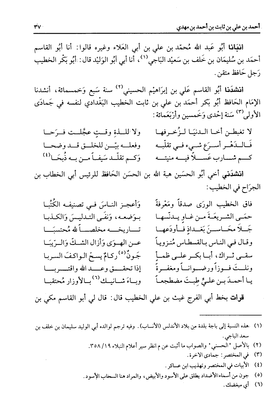 أنبأنا أبو عبد الله محمد بن علي بن أبي العلاء وغيره قالوا أنا أبو القاسم أحمد بن سليمان بن خلف بن سعيد الباجي (1) أنا أبي أبو الوليد قال أبو بكر الخطيب رجل حافظ متقن أنشدنا أبو القاسم علي بن إبراهيم الحسيني (2) سنة سبع وخمسمائة أنشدنا الإمام الحافظ أبو بكر أحمد بن علي بن ثابت الخطيب البغدادي لنفسه في جمادى الأولى (3) سنة إحدى وخمسين وأربعمائة لا تغبطن أخا الدنيا لزخرفها * ولا للذة وقت عجلت فرحا فالدهر أسرع شئ في تقلبه * وفعله بين للخلق قد وضحا كم شارب عسلا فيه منيته * وكم تقلد سيفا من به ذبحا (4) أنشدني أخي أبو الحسين هبة الله بن الحسن الحافظ للرئيس أبي الخطاب بن الجراح في الخطيب فاق الخطيب الورى صدقا ومعرفة * وأعجز الناس في تصنيفه الكتبا حمى الشريعة من غاو يدنسها * بوضعه ونفى التدليس والكذبا جلا محاسن بغداذ فأودعها * تاريخه مخلصا لله محتسبا وقال في الناس بالقسطاس منزويا * عن الهوى وأزال الشك والريبا سقى ثراك أبا بكر على ظمأ * جون (5) ركام يسح الواكف السربا ونلت فوزا ورضوانا ومغفرة * إذا تحقق وعد الله واقتربا يا أحمد بن علي طبت مضطجعا * وباء شانيك (6) بالأوزار محتقبا قرأت بخط أبي الفرج غيث بن علي الخطيب قال قال لي أبو القاسم مكي بن