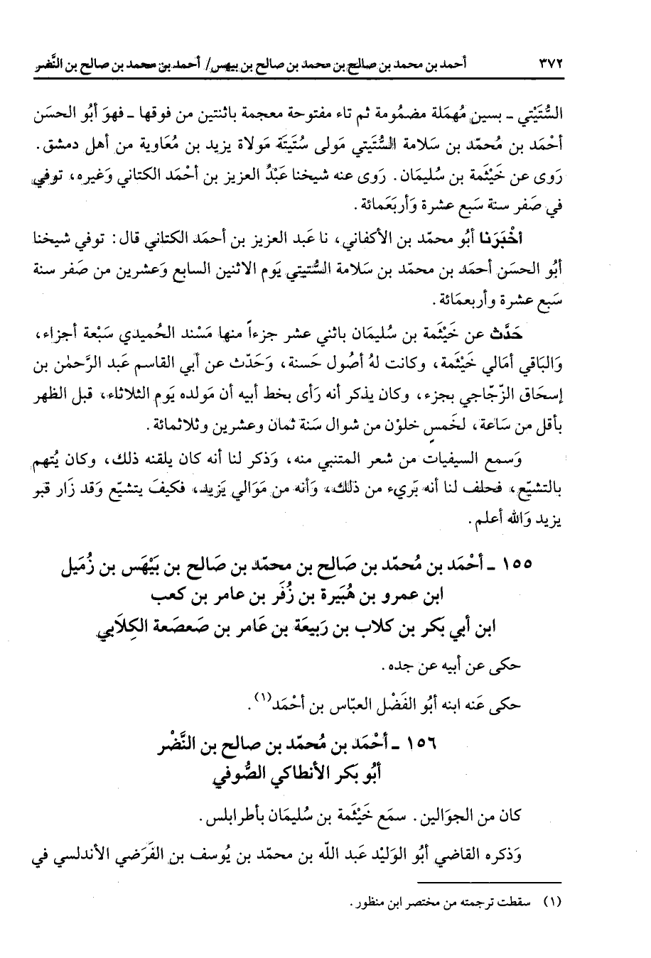 156 - أحمد بن محمد بن صالح بن النضر أبو بكر الأنطاكي الصوفي كان من الجوالين سمع خيثمة بن سليمان بأطرابلس وذكره القاضي أبو الوليد عبد الله بن محمد بن يوسف بن الفرضي الأندلسي في