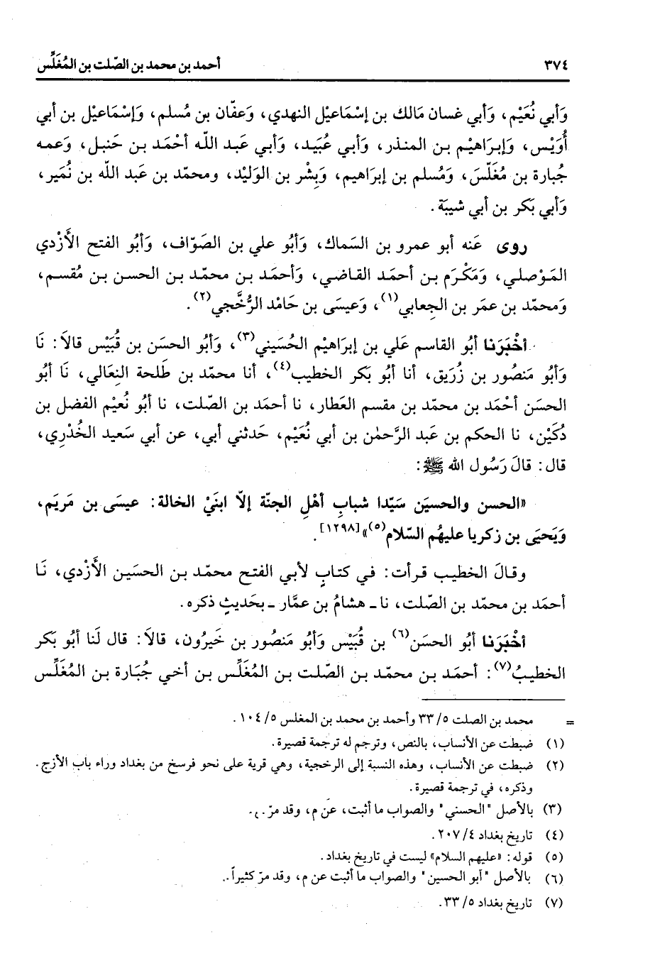 وأبي نعيم وأبي غسان مالك بن إسماعيل النهدي وعفان بن مسلم وإسماعيل بن أبي أويس وإبراهيم بن المنذر وأبي عبيد وأبي عبد الله أحمد بن حنبل وعمه جبارة بن مغلس ومسلم بن إبراهيم وبشر بن الوليد ومحمد بن عبد الله بن نمير وأبي بكر بن أبي شيبة روى عنه أبو عمرو بن السماك وأبو علي بن الصواف وأبو الفتح الأزدي الموصلي ومكرم بن أحمد القاضي وأحمد بن محمد بن الحسن بن مقسم ومحمد بن عمر بن الجعابي (1) وعيسى بن حامد الرخجي (2) أخبرنا أبو القاسم علي بن إبراهيم الحسيني (3) وأبو الحسن بن قبيس قالا نا وأبو منصور بن زريق أنا أبو بكر الخطيب (4) أنا محمد بن طلحة النعالي نا أبو الحسن أحمد بن محمد بن مقسم العطار نا أحمد بن الصلت نا أبو نعيم الفضل بن دكين نا الحكم بن عبد الرحمن بن أبي نعيم حدثني أبي عن أبي سعيد الخدري قال قال رسول الله (صلى الله عليه وسلم) الحسن والحسين سيدا شباب أهل الجنة إلا ابني الخالة عيسى بن مريم ويحيى بن زكريا عليهم السلام (5) وقال الخطيب قرأت في كتاب لأبي الفتح محمد بن الحسين الأزدي نا أحمد بن محمد بن الصلت نا هشام بن عمار بحديث ذكره أخبرنا أبو الحسن (6) بن قبيس وأبو منصور بن خيرون قالا قال لنا أبو بكر الخطيب (7) أحمد بن محمد بن الصلت بن المغلس بن أخي جبارة بن المغلس